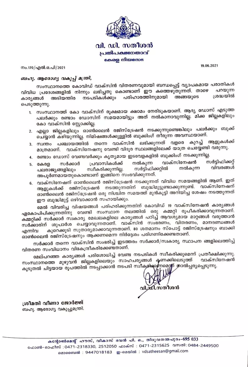 വാക്സിനേഷൻ : ആരോഗ്യമന്ത്രിക്ക് പ്രതിപക്ഷ നേതാവിന്റെ കത്ത്