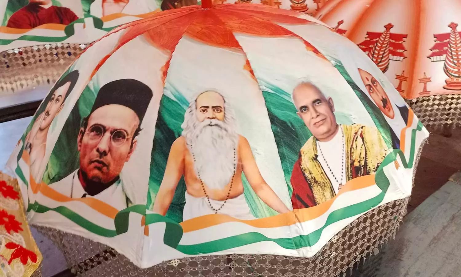 |മഹാത്മാ ഗാന്ധി, സുഭാഷ് ചന്ദ്രബോസ്, ശ്രീനാരായണ ഗുരു, ചട്ടമ്പി സ്വാമികൾ തുടങ്ങിയവർക്കൊപ്പമാണ് വി.ഡി സവർക്കറുടെയും ചിത്രം കുടകളിൽ ആലേഖനം ചെയ്തിരിക്കുന്നത്