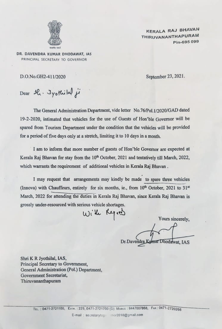 2021 ഒക്ടോബർ 10 മുതൽ 2022 മാർച്ച് വരെ രാജ്ഭവനിൽ കൂടുതൽ അതിഥികൾ എത്തുമെന്നും അവർക്ക് സഞ്ചരിക്കാൻ കൂടുതൽ വാഹനങ്ങൾ വേണമെന്നുമാണ് ഗവർണർക്ക് വേണ്ടി പ്രിൻസിപ്പൽ സെക്രട്ടറി സർക്കാരിനോട് ആവശ്യപ്പെട്ടത്. ഇന്നോവയടക്കം മൂന്ന് വാഹനങ്ങൾ, ഡ്രൈവർ ഉൾപ്പെടെ ആറു മാസത്തേക്ക് വിട്ടുനൽകണമെന്നാണ് കത്തിലെ ആവശ്യം.