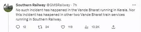 യാത്രക്കാര് ഇരിക്കുന്ന സീറ്റിനു സമീപമാണ് ചോര്ച്ച. മഴയില് ട്രെയിന് ചോരുമ്പോള് വെള്ളം പിടിക്കാനായി പ്ലാസ്റ്റിക് ട്രേ നിരത്തിവച്ചിരിക്കുന്നതും വീഡിയോയില് കാണാം. എട്ട് സെക്കൻഡ് ദൈർഘ്യമുള്ളതാണ് വീഡിയോ. വീഡിയോ വൈറലായതിനെത്തുടർന്ന് ദക്ഷിണ റെയിൽവേ ട്വിറ്ററിൽ പ്രതികരിച്ചു. കേരളത്തിൽ നിന്നോ മറ്റ് ദക്ഷിണേന്ത്യൻ സംസ്ഥാനങ്ങളിൽ നിന്നോ ഇത്തരത്തില് ഒരു സംഭവവും റിപ്പോർട്ട് ചെയ്തിട്ടില്ലെന്ന് വ്യക്തമാക്കി.