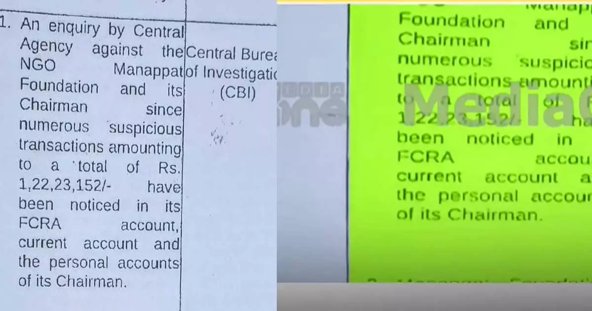 പുനർജനി വിവാദം; മണപ്പാട് ഫൗണ്ടേഷനെതിരെ സിബിഐ അന്വേഷണത്തിന് ശിപാര്ശ