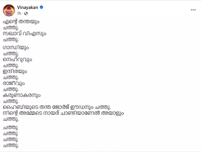 കൊച്ചി: അന്തരിച്ച മുൻ മുഖ്യമന്ത്രിമാരായ വി.എസ് അച്യുതാനന്ദൻ, ഉമ്മൻചാണ്ടി തുടങ്ങിയ പ്രമുഖ നേതാക്കൾക്കെതിരെ വീണ്ടും അധിക്ഷേപ പോസ്റ്റുമായി നടൻ വിനായകൻ. ഫേസ്ബുക്കിലൂടെയാണ് നടന്റെ അധിക്ഷേപം. ഇവര്ക്ക് പുറമെ മഹാത്മാ ഗാന്ധി , നെഹ്രു, ഇന്ദിരാ ഗാന്ധി, കെ.കരുണാകരൻ, ജോര്ജ് ഈഡൻ എന്നിവരുടെ പേര് എടുത്തുപറഞ്ഞുകൊണ്ടാണ് കുറിപ്പ് പോസ്റ്റ് ചെയ്തിരിക്കുന്നത്.