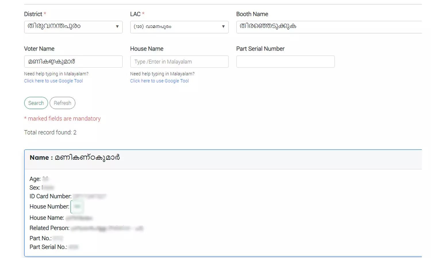 - വോട്ടര് ഐഡി കാര്ഡ് നമ്പര് ഉപയോഗിച്ചോ, വ്യക്തിഗത വിവരങ്ങള് ഉപയോഗിച്ചോ, രജിസ്റ്റര് ചെയ്ത മൊബൈല് നമ്പര് ഉപയോഗിച്ചോ വിവരങ്ങള് പരിശോധിക്കാം