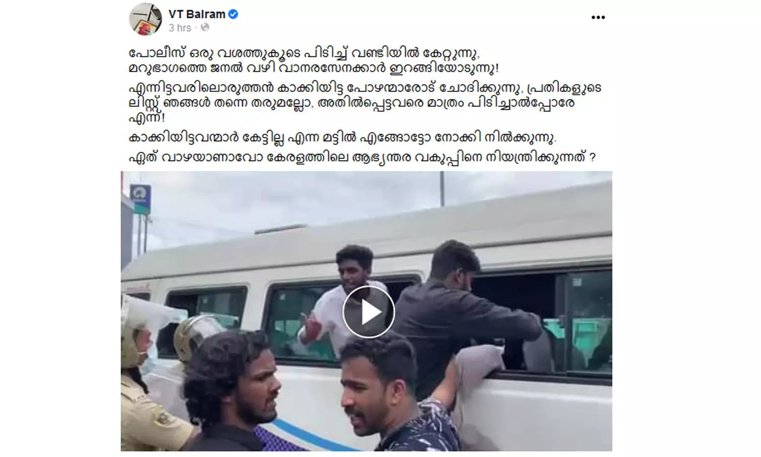 അറസ്റ്റ് ചെയ്ത് വാഹനത്തിൽ കയറ്റിയ യുവാക്കൾ പൊലീസിനോട് രോഷം കാണിക്കുന്ന വീഡിയോയാണ് പങ്കുവെച്ചിരിക്കുന്നത്. വാഹനത്തിൽ കയറ്റിയ യുവാക്കൾ മറുവശത്തെ ജനാലയിലൂടെ പുറത്തുചാടുന്നുണ്ട്. പ്രതിഷേധക്കാരിൽ ഒരാൾ 'പ്രതികളുടെ ലിസ്റ്റ് ഞങ്ങൾ തന്നെ തരുമല്ലോ, അതിൽപ്പെട്ടവരെ മാത്രം പിടിച്ചാൽപ്പോരേ' എന്ന് പൊലീസിനോട് ചോദിക്കുന്നത് ചൂണ്ടികാട്ടിയ ബൽറാം സംസ്ഥാന ആഭ്യന്തരവകുപ്പിനെതിരെയും വിമർശനം ഉന്നിയിച്ചിട്ടുണ്ട്.