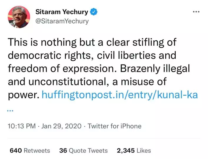 സി.പി.എം അഖിലേന്ത്യാ സെക്രട്ടറിയായ സിതാറാം യെച്ചൂരിയും കുനാല് കംറയുടെ യാത്രാവിലക്കിനെതിരെ രംഗത്തുവന്നിരുന്നു. 'ജനാധിപത്യ അവകാശങ്ങളേയും പൗര സ്വാതന്ത്ര്യങ്ങളേയും ആവിഷ്ക്കാര സ്വാതന്ത്ര്യങ്ങളേയും ശ്വാസം മുട്ടിച്ച് കൊല്ലുന്ന നടപടിയാണിത്. നിയമ വിരുദ്ധവും ഭരണാഘടനാ വിരുദ്ധവും അധികാര ദുർവ്വിനിയോഗവുമാണ് ഇവിടെ സംഭവിച്ചിരിക്കുന്നത്'. യെച്ചൂരി ട്വീറ്റ് ചെയ്തു. അന്ന് സിതാറാം യെച്ചൂരി പങ്കുവെച്ച ട്വീറ്റാണ് ഇപ്പോള് വി.ടി ബല്റാം ആയുധമാക്കിയിരിക്കുന്നുത്.