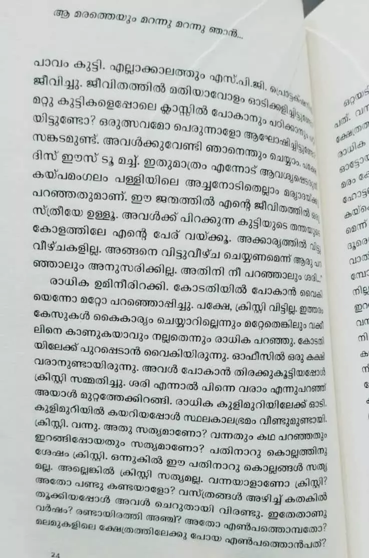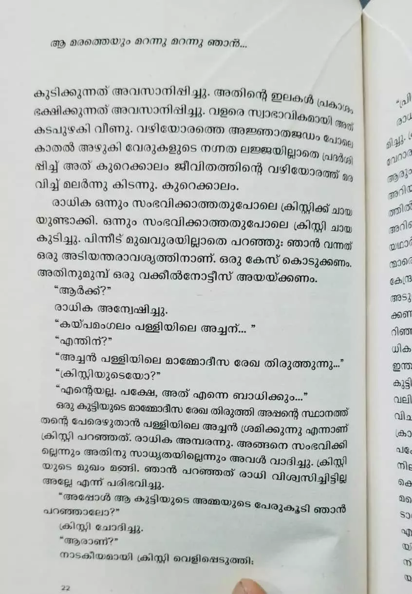 |'ആ മരത്തെയും മറന്നു മറന്നു ഞാൻ' എന്ന നോവലിലെ ഭാഗങ്ങളാണ് വിടി ബൽറാം ഫേസ്ബുക്കിൽ പങ്കുവെച്ചിരിക്കുന്നത്
