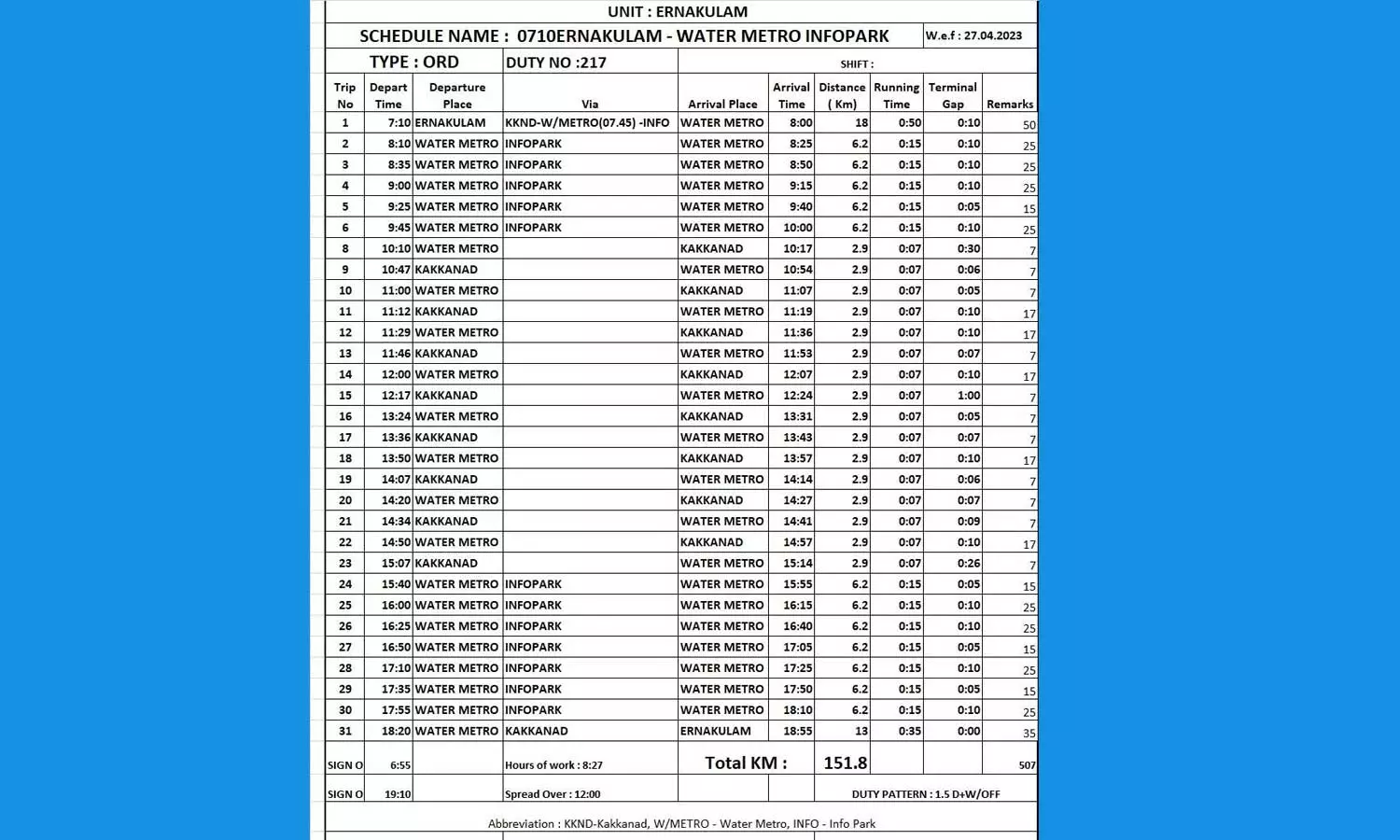 മെട്രോ ബോട്ട് വരുന്ന സമയം അനുസരിച്ച് 25 മിനിറ്റ് ഇടവേളകളിലാണ് സർവ്വീസ് നടത്തുക