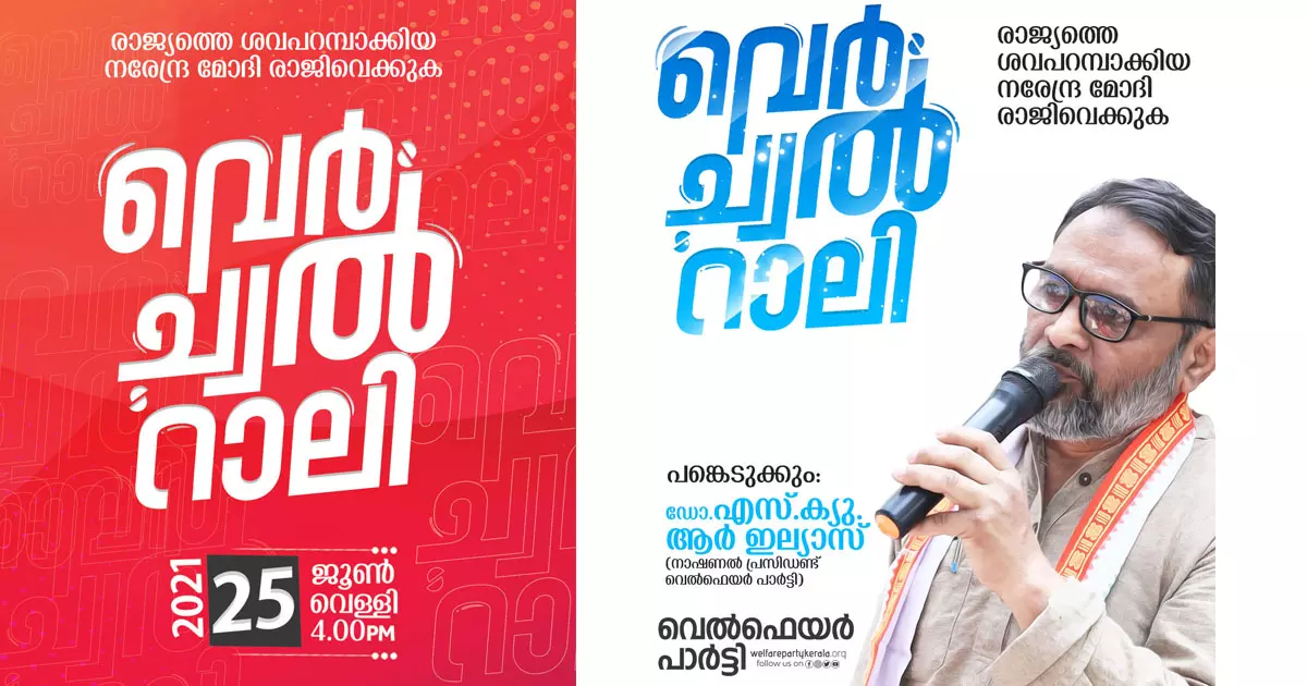 രാജ്യത്തെ ശവപറമ്പാക്കി മാറ്റിയ മോദി സർക്കാർ ഭരണം വിടുക എന്നാവശ്യപ്പെട്ട് രാജ്യവ്യാപകമായി വെൽഫെയർ പാർട്ടി നടത്തിക്കൊണ്ടിരിക്കുന്ന ഒരു മാസം നീണ്ടു നിന്ന പ്രക്ഷോഭങ്ങളുടെ സമാപനമായി വെൽഫെയർ പാർട്ടി കേരള സംസ്ഥാന കമ്മിറ്റി സംഘടിപ്പിക്കുന്ന വെർച്വൽ റാലി വെള്ളിയാഴ്ച വൈകിട്ട് നാല് മണിക്ക് നടക്കും. യൂട്യൂബ് ചാനലിലൂടെ ലൈവായി നടക്കുന്ന റാലി വെൽഫെയർ പാർട്ടി ദേശീയ അദ്ധ്യക്ഷൻ ഡോ.എസ്.ക്യൂ.ആർ ഇല്യാസ് ഉദ്ഘാടനം ചെയ്യും. പരാജയപ്പെട്ട കോവിഡ് പ്രതിരോധം, ലക്ഷദ്വീപിലെ സംഘ് കൈയ്യേറ്റം, പെട്രോളിയം വിലവർധന, പൗരത്വ നിഷേധം, കർഷക ദ്രോഹം, വിദ്യാർത്ഥികൾക്കെതിരെയും ജനാധിപത്യ ശബ്ദമുയർത്തുന്നവർക്കെതിരെയും നടത്തുന്ന ഭരണകൂട വേട്ട എന്നീ വിഷയങ്ങളുയർത്തിയാണ് ദേശീയ പ്രക്ഷോഭം മെയ് 25 മുതൽ ആരംഭിച്ചത്. കോവിഡ് സാമൂഹ്യ നിയന്ത്രണങ്ങൾ നിലവിലുള്ളതിനാലാണ് സമാപന റാലി വെർച്വൽ പ്ലാറ്റ്ഫോമില് നടക്കുന്നത്.