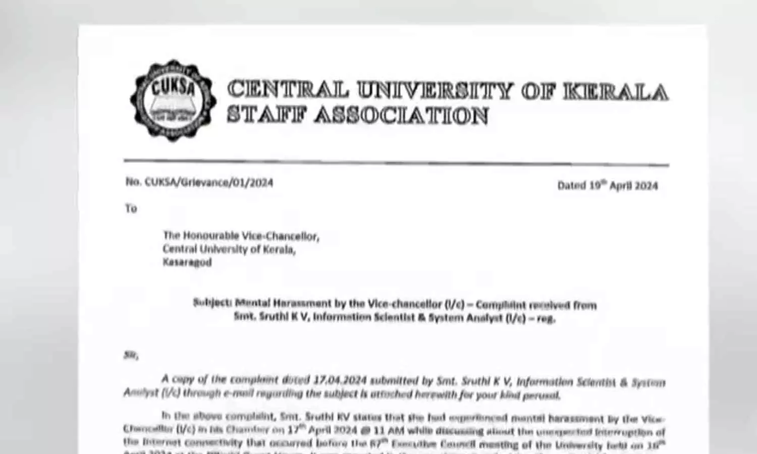 വനിത ഉദ്യോഗസ്ഥയെ ഭീഷണിപ്പെടുത്തി; കാസർകോട് സർവകലാശാല വി.സി ഇൻചാർജിനെതിരെ പരാതി