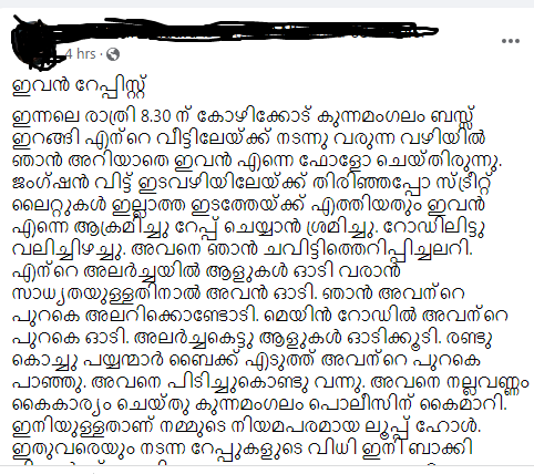 ഇവൻ റേപ്പിസ്റ്റ് ഇന്നലെ രാത്രി 8.30 ന് കോഴിക്കോട് കുന്നമംഗലം ബസ് ഇറങ്ങി എന്റെ വീട്ടിലേയ്ക്ക് നടന്നു വരുന്ന വഴിയിൽ ഞാൻ അറിയാതെ ഇവൻ എന്നെ ഫോളോ ചെയ്തിരുന്നു. ജംഗ്ഷൻ വിട്ട് ഇടവഴിയിലേയ്ക്ക് തിരിഞ്ഞപ്പോ സ്ട്രീറ്റ് ലൈറ്റുകൾ ഇല്ലാത്ത ഇടത്തേയ്ക്ക് എത്തിയതും ഇവൻ എന്നെ ആക്രമിച്ചു റേപ്പ് ചെയ്യാൻ ശ്രമിച്ചു. റോഡിലിട്ടു വലിച്ചിഴച്ചു. അവനെ ഞാൻ ചവിട്ടിത്തെറിപ്പിച്ചലറി. എന്റെ അലർച്ചയിൽ ആളുകൾ ഓടി വരാൻ സാധ്യതയുള്ളതിനാൽ അവൻ ഓടി. ഞാൻ അവന്റെ പുറകെ അലറിക്കൊണ്ടോടി. മെയിൻ റോഡിൽ അവന്റെ പുറകെ ഓടി. അലർച്ചകെട്ടു ആളുകൾ ഓടിക്കൂടി. രണ്ടു കൊച്ചു പയ്യന്മാർ ബൈക്ക് എടുത്ത് അവന്റെ പുറകെ പാഞ്ഞു. അവനെ പിടിച്ചുകൊണ്ടു വന്നു. അവനെ നല്ലവണ്ണം കൈകാര്യം ചെയ്തു കുന്നമംഗലം പൊലീസിന് കൈമാറി. ഇനിയുള്ളതാണ് നമ്മുടെ നിയമപരമായ ലൂപ്പ് ഹോൾ. ഇതുവരെയും നടന്ന റേപ്പുകളുടെ വിധി ഇനി ബാക്കി നിങ്ങൾക്ക് ഊഹിക്കാവുന്നതേയുള്ളൂ.