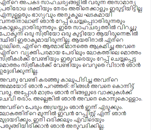 പക്ഷേ ഏതറ്റം വരെയും ഞാൻ പോകും. ഇവൻ ഈ സമൂഹത്തിൽ ഇനിയും പതിയിരിക്കാൻ പാടില്ല. ഇന്നലെ ഒരുപക്ഷേ എന്റെ അപകട സാഹചര്യങ്ങളിൽ വരുന്ന അസാമാന്യ പ്രതിരോധ ശക്തിയും നേരം അതിനെക്കാളും ഇരുട്ടിയിട്ടില്ല എന്നുള്ളതും ഭാഗ്യവും അനൂകൂല ഘടകമായി വന്നതിനാലാണ് ഞാൻ റേപ്പ് ചെയ്യപ്പെടാതിരുന്നതും കൊല്ലപ്പെടാതിരുന്നതും. ഇതേ സാഹചര്യത്തിൽ വിറച്ചു പോകുന്ന ഒരു സ്ത്രീയോ ഒരു കുട്ടിയോ ആയിരുന്നെങ്കിൽ സ്ഥിതി ഇതാകുമായിരുന്നില്ല. ആയതിനാൽ എന്റെ ഉടലിനെ, എന്റെ ആത്മാഭിമാനത്തെ ആക്രമിച്ച അവനെ എന്റെ വ്യക്തിപരമായ പേരിലും ലോകത്തിലെ മൊത്തം സ്ത്രീകൾക്ക് വേണ്ടിയും ഇതുവരെയും റേപ്പ് ചെയ്യപ്പെട്ട മൊത്തം സ്ത്രീകൾക്ക് വേണ്ടിയും വെറുതെ വിടാൻ ഞാൻ ഉദ്ദേശിക്കുന്നില്ല.