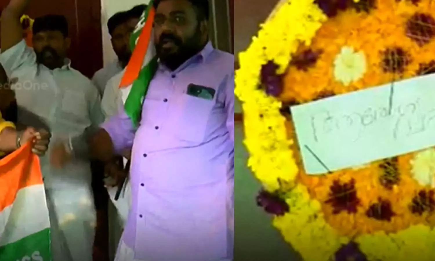'മരണവ്യാപാരിയായി മന്ത്രി മാറി': ആരോഗ്യ മന്ത്രിയുടെ ഔദ്യോഗിക വസതിയുടെ വാതിലിൽ റീത്ത് വച്ച് യൂത്ത് കോൺഗ്രസ് പ്രതിഷേധം