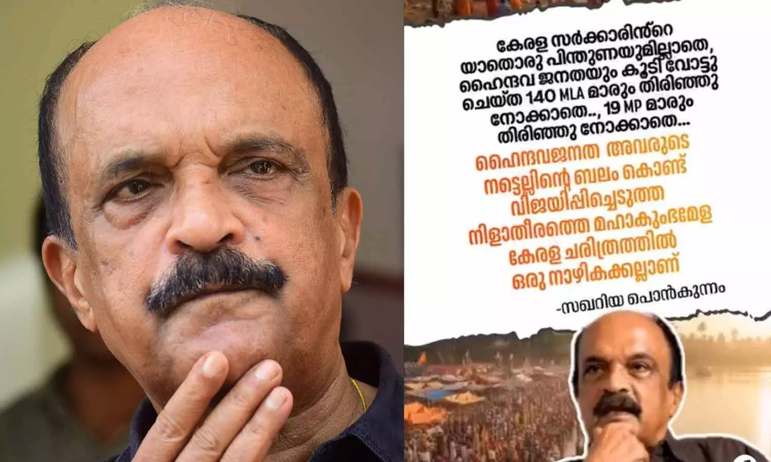 തിരുനാവായ കുംഭമേള കേരള ചരിത്രത്തില് ഒരു നാഴികക്കല്ലാണ് എന്ന പോസ്റ്റാണ് സഖറിയ പൊന്കുന്നം എന്നയാളുടെ പേരില് പ്രചരിപ്പിച്ചത്. ഇതിനൊപ്പം നല്കിയത് എഴുത്തുകാരന് സക്കറിയയുടെ ചിത്രവുമാണ്. 'കേരള സര്ക്കാറിന്റെ യാതൊരു പിന്തുണയുമില്ലാതെ, ഹൈന്ദവ ജനതയും കൂടി വോട്ട് ചെയ്ത 140 എംഎല്എമാരും തിരിഞ്ഞുനോക്കാതെ, 19 എംപിമാരും തിരിഞ്ഞുനോക്കാതെ, ഹൈന്ദവ ജനത അവരുടെ നട്ടെല്ലിന്റെ ബലം കൊണ്ട് വിജയിപ്പിച്ചെടുത്ത നിളാതീരത്തെ മഹാകുംഭമേള കേരള ചരിത്രത്തില് നാഴികക്കല്ലാണ്' -എന്നാണ് സക്കറിയയുടെ ചിത്രവുമായി പ്രചരിക്കുന്ന പോസ്റ്റില് പറയുന്നത്.