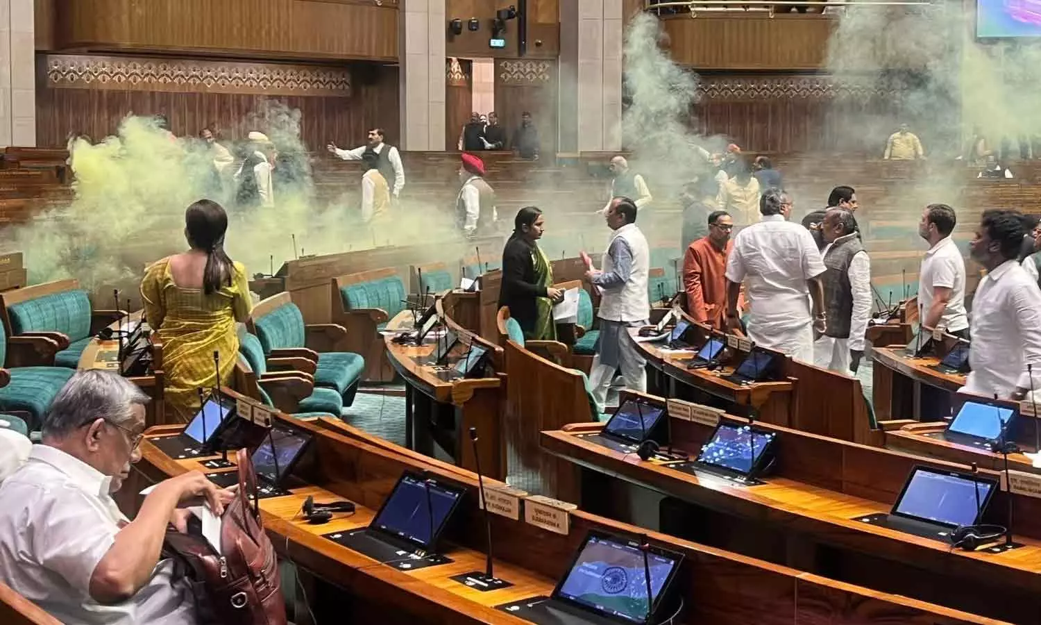 പാർലമെന്റിലെ എല്ലാ സുരക്ഷാ സംവിധാനങ്ങളും മറികടന്ന് രണ്ടുപേർ നടുത്തളത്തിലേക്ക് ചാടിവീണ് നടത്തിയ പുകയാക്രമണം വലിയ സുരക്ഷാ വീഴ്ചയായി. 2001ൽ നടന്ന പാർലമെന്റ് ആക്രമണത്തിന്റെ വാർഷിക ദിനത്തിലായിരുന്നു വൻ സുരക്ഷാ വീഴ്ചയുണ്ടായത്. ഡിസംബർ -13ന് സന്ദർശക ഗാലറിയിൽനിന്ന് സഭാതളത്തിലേക്ക് ചാടിയ രണ്ടുപേർ പുക തുറന്നുവിടുകയായിരുന്നു. പാർലമെന്റിന് പുറത്തും രണ്ടുപേർ മുദ്രാവാക്യം മുഴക്കി പ്രതിഷേധിച്ചു. സംഭവവുമായി ബന്ധപ്പെട്ട് സാഗർ ശർമ, നീലം ദേവി, അമോൽ ഷിൻഡെ, വിശാൽ ശർമ എന്നിവരെ പൊലീസ് അറസ്റ്റ് ചെയ്തു. പുകയാക്രമണത്തിന്റെ സൂത്രധാരനെന്ന് കരുതുന്ന ലളിത് മോഹൻ ഢാ പിന്നീട് കർത്തവ്യപഥ് സ്റ്റേഷനിൽ കീഴടങ്ങുകയായിരുന്നു. പ്രതികൾക്കെതിരെ യു.എ.പി.എ ചുമത്തി കേസെടുത്തു.