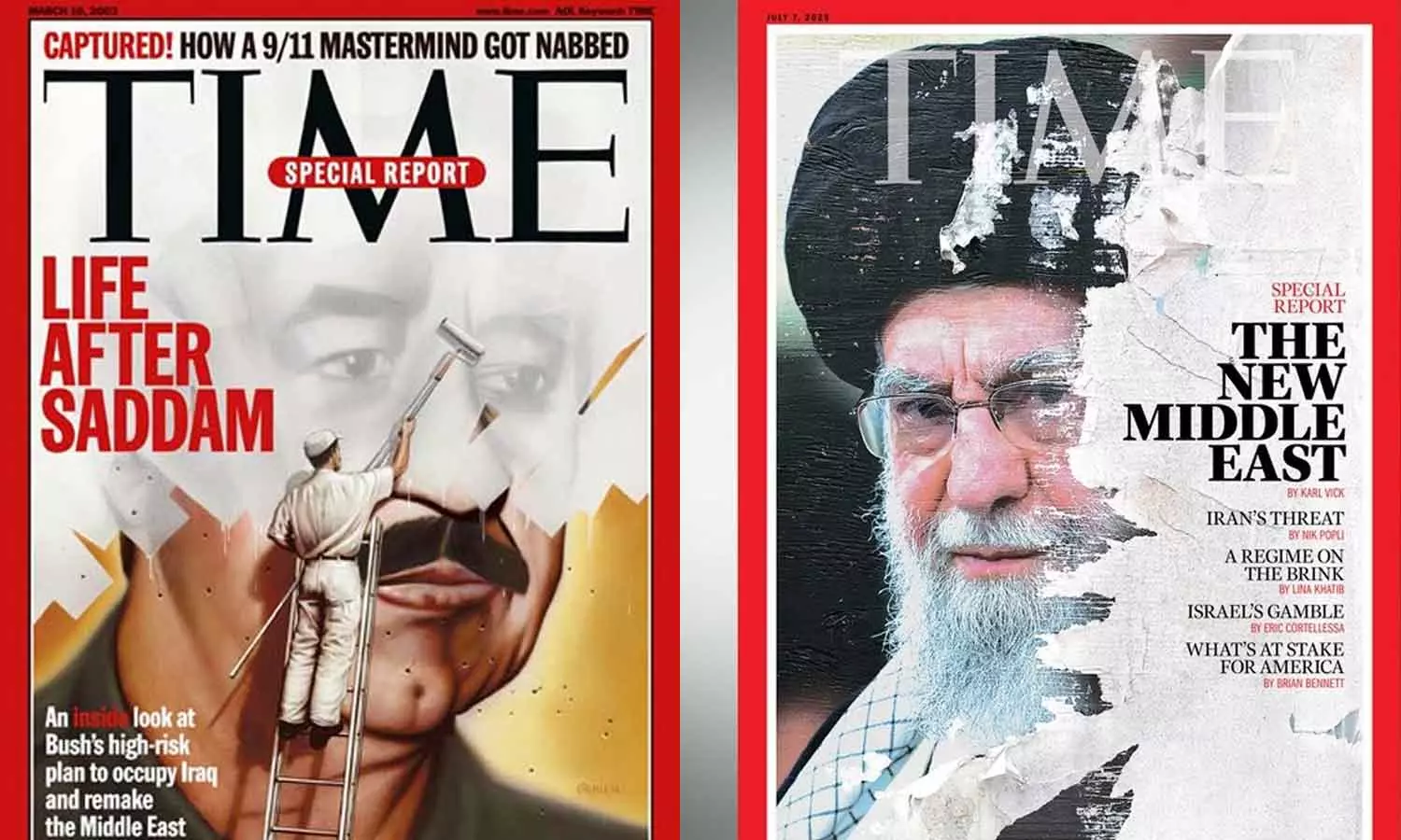 അതിനിടയിലാണ് 2003 മാർച്ച് മാസത്തെ ടൈം മാഗസിന്റെ കവറിനെ കുറിച്ചും ഇപ്പോൾ ചർച്ചകൾ ഉയരുന്നത്. ഖമനയി കവറിന് ഏതാണ്ട് സമാനമായിരുന്നു അന്നത്തെ സദ്ദാം ഹുസൈന്റെ കവർ ചിത്രം. സദ്ദാം ഹുസൈന്റെ മുഖത്തിന് മുകളിൽ ഏണി ചാരി, ഒരു പെയിന്റർ വെള്ളയടിച്ച് മുഖം മായ്ക്കുന്ന ചിത്രമായിരുന്നു അത്. ആ റിപ്പോർട്ടിന്റെ തലക്കെട്ടും ഏതാണ്ട് സമാനമായിരുന്നു. LIFE AFTER SADDAM: An Inside look at Bush's high risk plan to occupy iraq and remake the middle east.