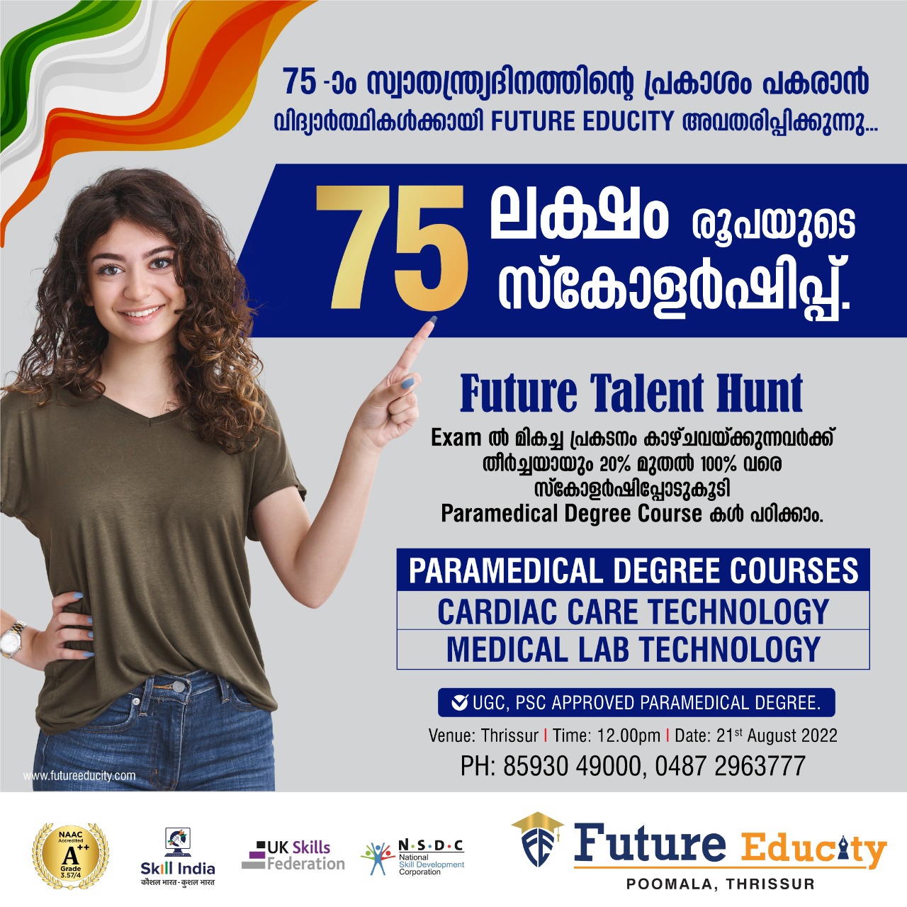 75ാം സ്വാതന്ത്ര്യദിനത്തിനോടനുബന്ധിച്ച് 75 ലക്ഷം രൂപയുടെ സ്കോളർഷിപ്പ് പദ്ധതി പ്രഖ്യാപിച്ച് തൃശൂര് പൂമലയിലെ Future Educity. പ്ലസ്ടു കഴിഞ്ഞ, പാരാ മെഡിക്കൽ മേഖലയില് തുടര്പഠനം ആഗ്രഹിക്കുന്ന വിദ്യാര്ത്ഥികള്ക്കാണ് ഈ സ്കോളർഷിപ്പ് നല്കുന്നത്.