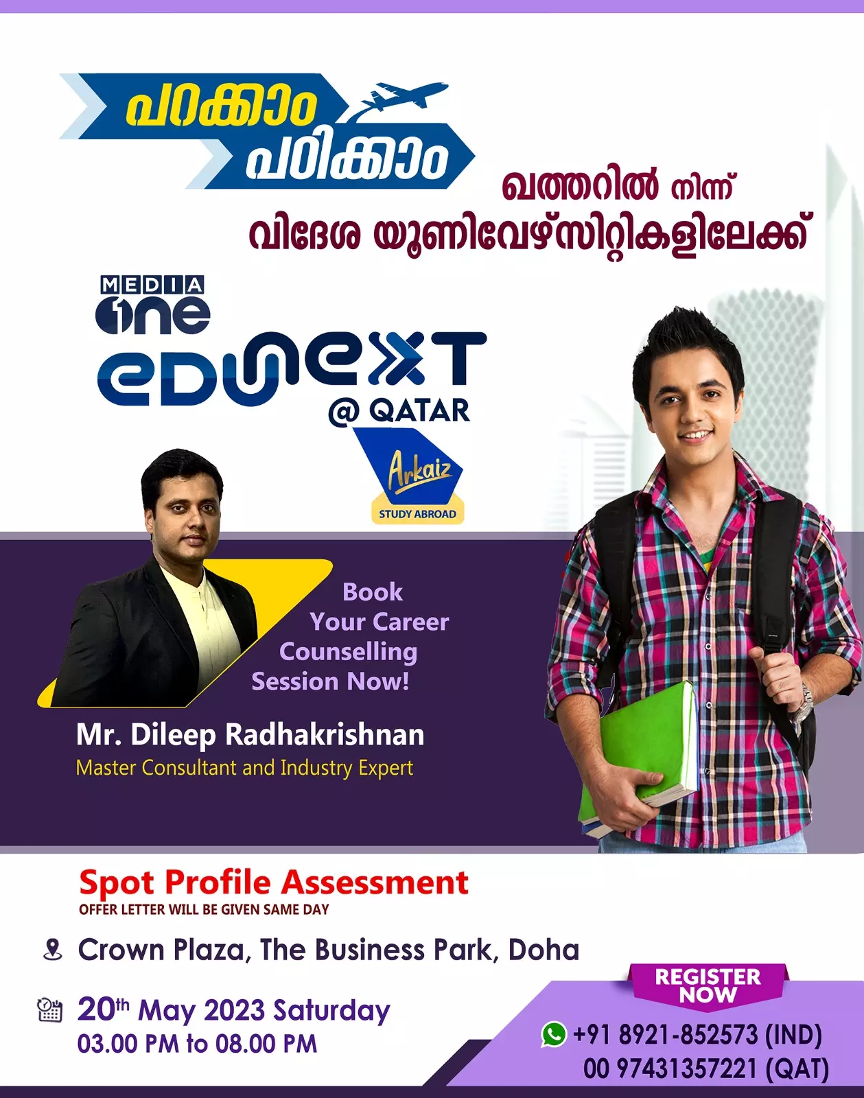 ഇനി നല്ല രാജ്യമേതാണ്, യൂണിവേഴ്സിറ്റിയേതാണ്, ചെലവ് എത്ര വരും, സ്കോളര്ഷിപ്പ് കിട്ടുമോ എന്നിങ്ങനെയുള്ള ആശങ്കയുള്ളവര്ക്ക് അതിനുള്ള പരിഹാരമാണ് മീഡിയവണ് EDUNEXT. മെയ് 20 വൈകീട്ട് മൂന്ന് മണി മുതല് എട്ടുമണിവരെ ദോഹ ക്രൗണ് പ്ലാസയിലാണ് അടുത്ത മീഡിയവണ് EDUNEXT നടക്കുന്നത്.