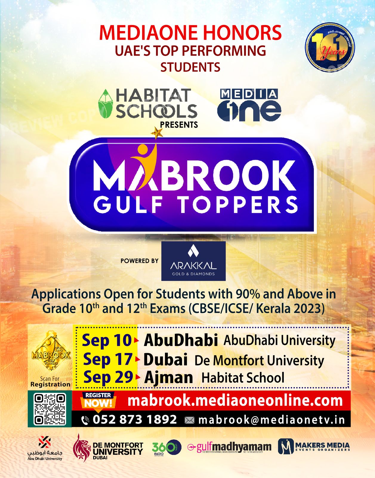 അബുദാബി, ദുബൈ, അജ്മാൻ എന്നിങ്ങനെ മൂന്നിടങ്ങളിലായാണ് യു എ യിൽ വിദ്യാർത്ഥികളെ ആദരിക്കുന്ന ചടങ്ങ് ഒരുക്കുന്നത്. സി. ബി. എസ്. ഇ ,ഐ.സി.എസ്.ഇ സിലബസുകളിൽ പത്താം ക്ലാസ്സ് ,പ്ലസ് ടു പരീക്ഷകളിൽ 90 ശതമാനമോ അതിൽ കൂടുതലോ മാർക്ക് നേടിയ വിദ്യാർത്ഥികളെയും കേരള സിലബസിൽ മുഴുവൻ വിഷയങ്ങളിൽ എ പ്ലസ് നേടി വിജയിച്ചവരെയുമാണ് മീഡിയ വൺ മബ്റൂക് ഗൾഫ് ടോപ്പേഴ്സ് പുരസ്കാരം നൽകി ആദരിക്കുന്നത്.