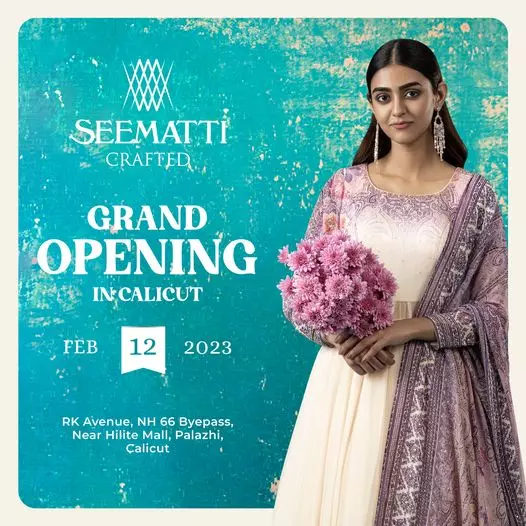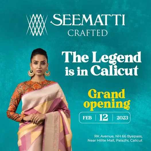 |ദേശീയപാതയിൽ ഹൈലൈറ്റ്മാളിന് സമീപം ശീമാട്ടിയുടെ പുതിയ ഷോറൂം സിഇഒ ബീനാകണ്ണൻ ഉദ്ഘാടനം ചെയ്യും.