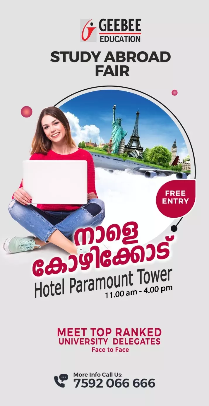 ഉന്നത പഠനത്തിന് വിദേശത്തേക്ക് പോവുക എന്നതാണ് ഇന്നത്തെ തലമുറയുടെ സ്വപ്നം. ആ സ്വപ്നം സാക്ഷാത്കരിക്കാനുള്ള അറിവുകളും വിവരങ്ങളും വിരല്തുമ്പില് ലഭ്യമാണുതാനും. പക്ഷേ, കോഴ്സിന്റെ തെരഞ്ഞെടുപ്പ്, പഠനചെലവ് തുടങ്ങി വിദേശപഠനവുമായി ബന്ധപ്പെട്ട് നൂറ് സംശയങ്ങളാണ് വിദ്യാര്ത്ഥികള്ക്കും രക്ഷിതാക്കള്ക്കും ഉള്ളത്. ഇതുമായി ബന്ധപ്പെട്ട എല്ലാ സംശയങ്ങള്ക്കുമുള്ള മറുപടിയാണ് ഇന്ന് കോഴിക്കോട് നടക്കുന്ന സ്റ്റഡി എബ്രോഡ് ഫെയര്. കോഴിക്കോട് പാരമൗണ്ട് ടവറില് രാവിലെ 11 മണിമുതലാണ് ഫെയര്.സ്റ്റഡി അബ്രോഡ് കണ്സള്ട്ടിംഗ് രംഗത്ത് 20ലേറെ വര്ഷത്തെ പാരമ്പര്യമുള്ള Geebee educationനാണ് ഈ ഫെയറിന്റെ സംഘാടകര്.