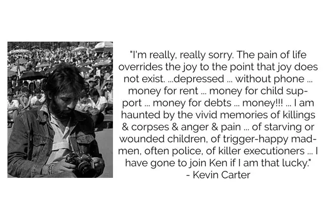 1993 മാര്ച്ച് 27 ന്യൂയോര്ക്ക് ടൈംസിന്റെ ഓഫീസ്. ടെലിഫോണ് ശബ്ദിച്ചുകൊണ്ടേയിരിക്കുന്നു. ജീവനക്കാര്ക്ക് ഫോണ്കോളുകള്ക്ക് മറുപടി പറഞ്ഞു മതിയായി. വിളിച്ചവര്ക്കെല്ലാം അറിയേണ്ടത് ഒറ്റ കാര്യം. തലേ ദിവസം ന്യൂയോര്ക്ക് ടൈംസിന്റെ ഒന്നാം പേജില് അച്ചടിച്ച ചിത്രത്തിലെ പെണ്കുട്ടിക്കെന്തു സംഭവിച്ചു. ആ ചിത്രമെടുത്തത് കെവിന് കാര്ട്ടറായിരുന്നു. കഴുകനും പെണ്കുഞ്ഞും എന്ന ആ ചിത്രം ലോകവ്യാപകമായി ഖ്യാതി നേടി. കുട്ടിക്ക് ക്യാമ്പിലെത്താനുള്ള ആരോഗ്യമുണ്ടായിരുന്നു. പക്ഷേ, ക്യാമ്പിലെത്തിയോ എന്നറിയില്ല. കാര്ട്ടറെ ഉദ്ധരിച്ച് പത്രം കുറിപ്പിറക്കി. ഫോട്ടോഗ്രാഫ് കണ്ടവര് കാര്ട്ടറിന്റെ മാനുഷികതയെ ചോദ്യം ചെയ്തു. ഫോട്ടോ എടുക്കാന് വേണ്ടി കുഞ്ഞിന്റെ ജീവന് രക്ഷിക്കാതിരുന്ന ഫോട്ടോഗ്രാഫറാണ് കെവിന് എന്ന നിലയില് അയാള് വിമര്ശനങ്ങള്ക്ക് ഇരയായി. അയാള് കുറ്റബോധം കൊണ്ട് നീറിപുകഞ്ഞു.