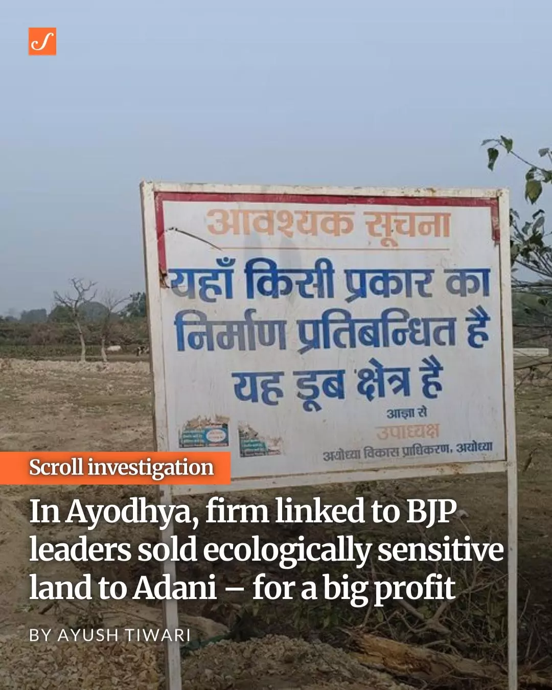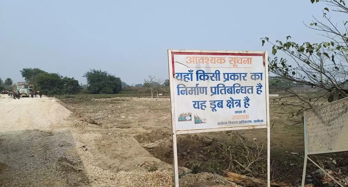 ടൈം സിറ്റി അദാനി ഗ്രൂപ്പിന് വിറ്റ ഭൂമി, മജ്ഹ ജംതാരയിലെ തണ്ണീര്ത്തടത്തില് നിര്മാണം നടത്തുന്നത് തടയുന്ന അയോധ്യ വികസന അതോറിറ്റിയുടെ ബോര്ഡ് | ആയുഷ് തിവാരി പകര്ത്തിയ ഫോട്ടോ.