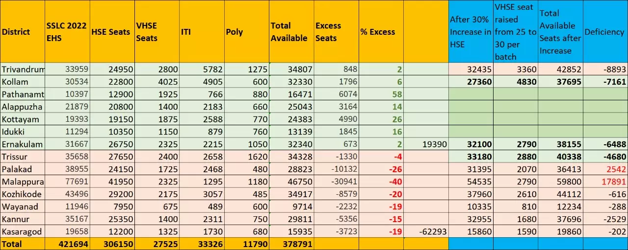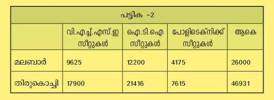 വി.എച്ച്.എസ്.ഇ, ഐ.ടി.ഐ, പോളിടെക്നിക് പഠന സാധ്യതകള് കൂടി പരിഗണിച്ചാലും എല്ലാ വര്ഷവും മലബാറില് ഉപരിപഠനം സൗകര്യം ലഭിക്കാതെ കാല് ലക്ഷം വിദ്യാര്ഥികളുണ്ടാവാറുണ്ട്. മിക്ക തെക്കന് ജില്ലകളിലും അപേക്ഷകരേക്കാള് പ്ലസ് വണ് സീറ്റുകളുള്ളപ്പോഴാണ് ഇതെന്നോര്ക്കുക. പത്താം ക്ലാസ് പഠനശേഷമുള്ള മുഴുവന് ഉപരിപഠന സൗകര്യങ്ങളും തെക്കന് ജില്ലകളിലാണ് കേന്ദ്രീകരിച്ചിരിക്കുന്നത്. രണ്ട് ലക്ഷത്തോളം വരുന്ന പ്ലസ് വണ് സീറ്റുകള്ക്ക് പുറമെ ഐ.ടി.ഐ, വി.എച്ച്.എസ്.ഇ, പോളിടെക്നിക്ക് മേഖലയില് 46,931 സീറ്റുകള് തിരുകൊച്ചി മേഖലയിലുണ്ട്.