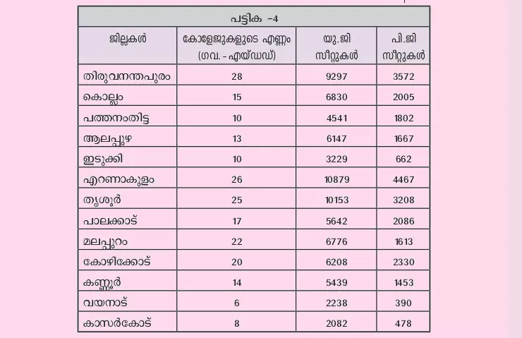 സംസ്ഥാനത്തെ സര്ക്കാര് എയ്ഡഡ് മേഖലയിലെ പി.ജി സീറ്റുകള് 29,292 ആണ്. ഇതില് 20,942 സീറ്റും തിരുവനന്തപുരം മുതല് തൃശൂര് വരെയുള്ള ജില്ലകളിലാണ്. വെറും 8,350 പി.ജി സീറ്റുകള് മാത്രമാണ് മറ്റു ആറു ജില്ലകളിലുള്ളത്. (പട്ടിക നോക്കുക)