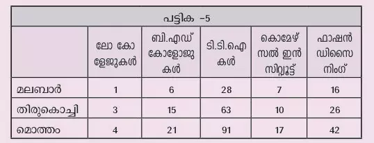 മെഡിക്കല് കോളജ്, എഞ്ചിനീയറിംഗ് കോളജ് എന്നിവയുടെ എണ്ണത്തിലും സീറ്റുകളിലും ഈ വിവേചനത്തിന്റെ തുടര്ച്ച കാണാം. ഏറ്റവും കൂടുതല് ഹയര്സെക്കന്ററി വിദ്യാര്ഥികള് വിജയിക്കുന്ന മലപ്പുറം ജില്ലയിലും പിന്നാക്ക ജില്ലയായ കാസര്കോടും ഒരൊറ്റ സര്ക്കാര് എഞ്ചിനീയറിംഗ് കോളജുമില്ല. മറ്റു പ്രഫഷണല് ട്രെയ്നിംഗ് ഇന്സ്റ്റിറ്റ്യൂട്ടുകളുടെയും കോഴ്സുകളുടെയും സ്ഥിതി ഭിന്നമല്ല. മലപ്പുറം, വയനാട്, കാസര്കോട് ജില്ലകളില് സര്ക്കാറിനു കീഴില് ബി.എഡ് കോളജുകളില്ല. സംസ്ഥാനത്തെ 21 ബി.എഡ് കോളജുകളില് 15 ഉം തിരുകൊച്ചി ജില്ലകളിലാണ്. ടീച്ചിംഗ് ഇന്സ്റ്റിറ്റ്യൂട്ടിന്റെ (ടി.ടി.ഐ) സ്ഥിതിയും തഥൈവ. 91 ടി.ടി.ഐ കളില് 63 എണ്ണവും തിരുകൊച്ചിയില്. മലബാറില് 28 മാത്രം. 4911 ടി.ടി.ഐ സീറ്റുകളാണ് സംസ്ഥാനത്തുള്ളത്. ഇതില് 3311 സീറ്റും മലബാറിനു പുറത്താണ്. 1600 മാത്രമാണ് പാലക്കാട് മുതല് കാസര്കോട് വരെയുള്ള ജില്ലകളിലുള്ളത്. 4 ലോ കോളജുകളില് കോഴിക്കോട്ടെ ഒന്നു മാത്രമാണ് മലബാറിന് അവകാശപ്പെട്ടത്. കൊമേഴ്സല്, ഫാഷന് ഡിസൈനിംഗ് കോഴ്സുകളുടെ കണക്കുകളും ഇതിന്റെ തുടര്ച്ചയാണ്. (പട്ടിക നോക്കുക)