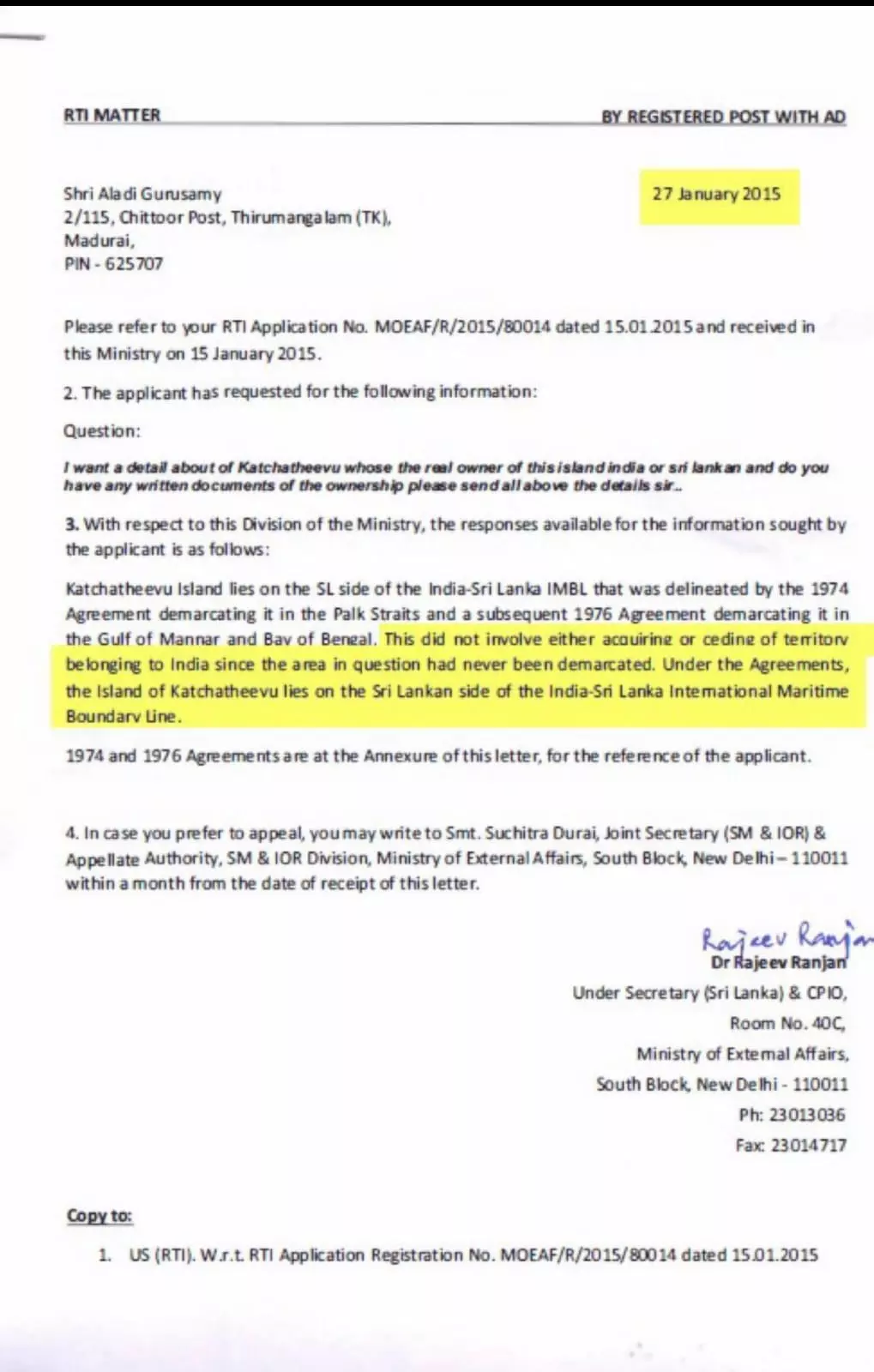 സുഷമാ സ്വരാജ് വിദേശകാര്യ മന്ത്രിയായിരുന്ന വേളയില് വിദേശകാര്യ സെക്രട്ടറിയായിരുന്നു എസ്. ജയശങ്കര് 2015 ജനുവരി 27ന് കച്ചത്തീവ് സംബന്ധിച്ച വിവരാവകാശ ചോദ്യത്തിന് നല്കിയ മറുപടി ഇപ്രകാരമായിരുന്നു: ' ഇന്ത്യയുടെ ഭൂപ്രദേശം ഏറ്റെടുക്കുന്നതോ വിട്ടുകൊടുക്കുന്നതോ ആയ ഒന്നും ഈ കരാറില് ഉള്പ്പെട്ടിട്ടില്ല. കാരണം, പ്രസ്തുത പ്രദേശം ഒരിക്കലും അതിര്ത്തി നിര്ണ്ണയിക്കപ്പെട്ടിരുന്നില്ല. ഉടമ്പടി പ്രകാരം കച്ചത്തീവ് സ്ഥിതി ചെയ്യുന്നത് ഇന്ത്യ-ശ്രീലങ്ക അന്താരാഷ്ട്ര സമുദ്രാതിര്ത്തി രേഖയുടെ ശ്രീലങ്കന് ഭാഗത്താണ്'.