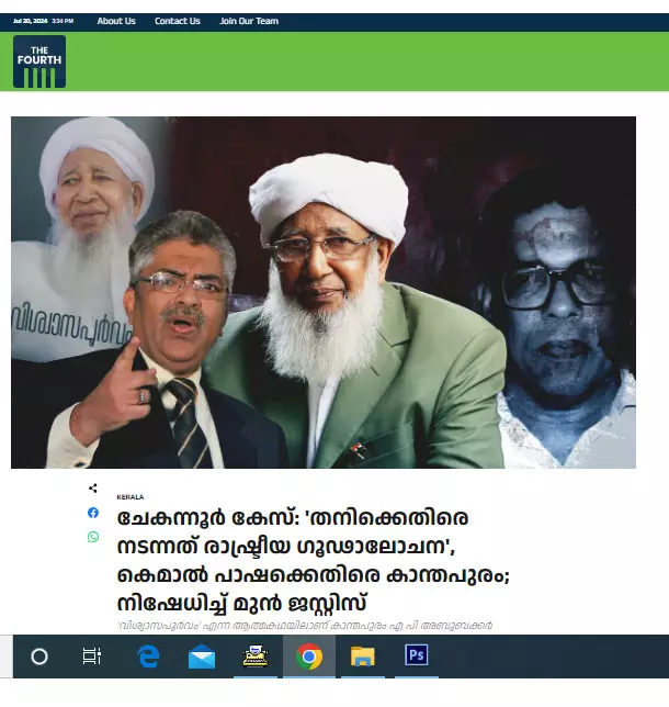 കമാല്പാഷക്കെതിരേ കാന്തപുരം: ചേകന്നൂര് തിരോധാനക്കേസ് പരിഗണിച്ചിരുന്ന അന്നത്തെ സി.ബി.ഐ സ്പെഷ്യല് ജഡ്ജ് കമാല് പാഷ, എ.പി അബൂബക്കര് മുസ്ലിയാര്ക്കെതിരേ ഗൂഢാലോചന നടത്തിയെന്നാണ് പുസ്തകം ആരോപിച്ചത്: ''സി.ബി.ഐ സ്പെഷ്യല് കോടതി ജഡ്ജിയായി കമാല് പാഷ നിയമിതനായ ശേഷമായിരുന്നു കേസില് പ്രതിചേര്ക്കുന്നത്. വിചാരണ തുടങ്ങിയ കേസിലെ അത്യപൂര്വ നീക്കമായിട്ടാണ് അന്നുതന്നെ എല്ലാവരും വിലയിരുത്തിയിരുന്നത്. പിന്നീടാണ് ഗൂഢാലോചന തെളിഞ്ഞത്. മര്ക്കസിന്റെ മേല്നോട്ടത്തില് തുടങ്ങാനിരുന്ന മെഡിക്കല് കോളജ് തട്ടിയെടുക്കാന് ലീഗ് നേതാക്കള് ഉള്പ്പെടെ വ്യാജ രേഖകള് ഉണ്ടാക്കി. മര്ക്കസിന്റെ കീഴിലെ ഇമാം റാസി എജ്യുക്കേഷണല് ട്രസ്റ്റിനെ സ്വന്തമാക്കുകയായിരുന്നു ലക്ഷ്യം. മുസ്ലിംലീഗ് അധ്യക്ഷനായിരുന്ന പാണക്കാട് സയ്യിദ് മുഹമ്മദലി ശിഹാബ് തങ്ങള് പ്രസിഡന്റും വി.വി അബൂബക്കര് ഹാജി ചാവക്കാട് സെക്രട്ടറിയായുമാണ് വ്യാജരേഖ ഉണ്ടാക്കിയത്. ഈ ട്രസ്റ്റില് കമാല് പാഷയും അംഗമായിരുന്നു,''.... (ഫോര്ത്ത് ന്യൂസ് ജൂണ് 13, 2024, ഉദ്ധരിച്ചത്)