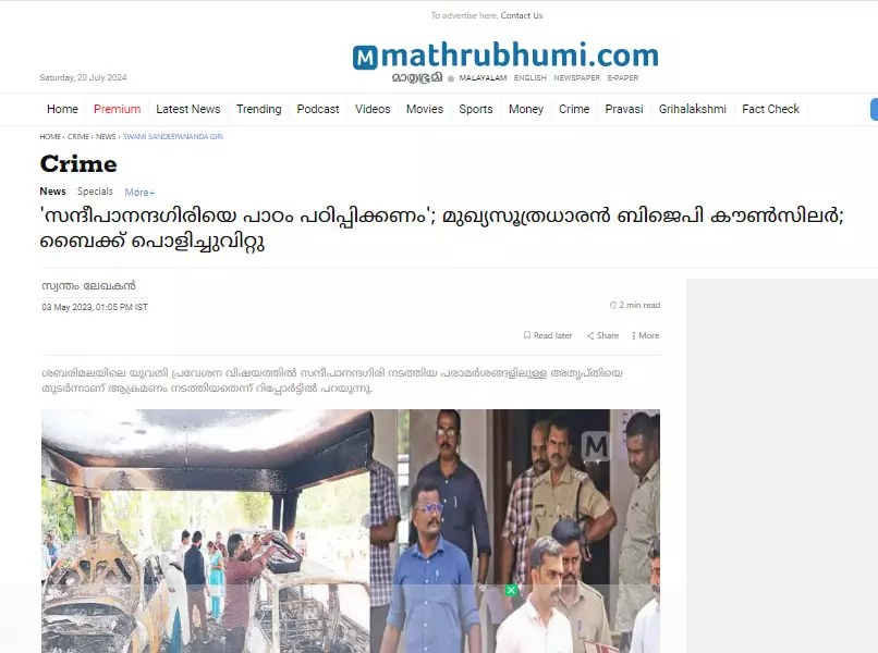 സ്കൂള് ഓഫ് ഭഗവദ്ഗീത സ്ഥാപകനും ആത്മീയ നേതാവുമായ സ്വാമി സന്ദീപാനന്ദഗിരി പൊതുവേ, ഇടതുപക്ഷത്തോടു ചേര്ന്നു നില്ക്കുന്ന വ്യക്തിയാണ്. സംഘ്പരിവാര് പ്രതിനിധാനം ചെയ്യുന്ന ഹിന്ദുത്വ രാഷ്ട്രീയത്തിന്റെ ശക്തനായ വിമര്ശകനുമാണ് അദ്ദേഹം. സ്വാമി ചിന്മയാനന്ദന്റെ അനുയായി ആയിരുന്ന അദ്ദേഹത്തെ ആര്.എസ്.എസ്സുകാര് ഒരു സ്വാമിയായിപ്പോലും കാണുന്നില്ല; കപട സ്വാമി എന്നാണ് വിളിക്കുന്നത് തന്നെ. ശബരിമല സ്ത്രീ പ്രവേശനവുമായി ബന്ധപ്പെട്ട് അദ്ദേഹം നടത്തിയ ഇടപെടലുകള് അവരില് അമര്ഷം ഉണ്ടാക്കിയിരുന്നു ('സന്ദീപാനന്ദഗിരിയെ പാഠം പഠിപ്പിക്കണം'; മുഖ്യസൂത്രധാരന് ബി.ജെ.പി കൗണ്സിലര്, മാതൃഭൂമി, 3 മെയ് 2023). 2018 ഒക്ടോബര് 27-നു അദ്ദേഹത്തിന്റെ ആശ്രമത്തിനു നേരേ നടന്ന തീവയ്പ്പില് ഇതും സ്വാധീനം ചെലുത്തിയിരുന്നു. എന്നാല്, ഈ സംഭവത്തില് ചേകന്നൂര് മൗലവി കേസില് മുസ്ലിം സമുദായത്തെയൊന്നാകെ പ്രതിസ്ഥാനത്ത് നിറുത്തുന്ന പോലെയുള്ള പ്രയോഗങ്ങള് 'ഹൈന്ദവ വിശ്വാസികളെ' യാഥാസ്ഥികരെന്നോ മൗലികവാദികളെന്നോ പൊതുവായി വ്യവഹരിക്കുന്ന വിധത്തില് മാധ്യമ ചര്ച്ചകളുമൊന്നും കേരളത്തില് വികസിച്ചുവന്നില്ല. ബി.ജെ.പിയും ഹൈന്ദവതയും തമ്മിലുള്ള ബന്ധം വിഭജിച്ചാണ് റിപ്പോര്ട്ടുകള് വന്നത്.