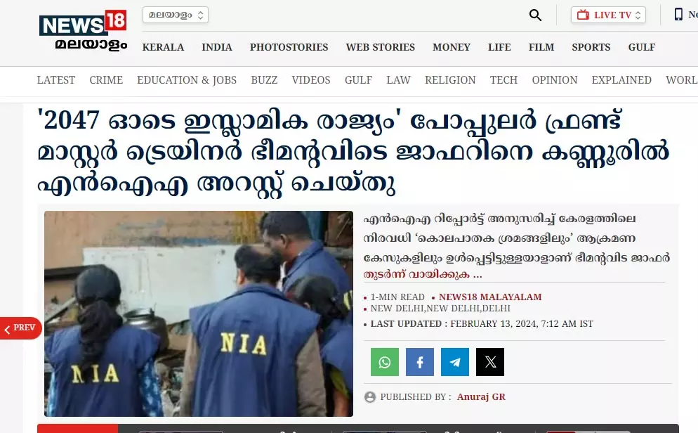 മാധ്യമവല്കൃത ഇസ്ലാമോഫോബിയയുടെ മറ്റൊരു എപ്പിസോഡാണിത്. ജാഫര് ഭീമന്റവിട എന്നയാളെ എന്.ഐ.എ സംഘം അറസ്റ്റ് ചെയ്തതായി ഫെബ്രുവരി 12നാണ് വാര്ത്ത പുറത്തുവന്നത്. 2047ല് ഇന്ത്യയില് ഇസ്ലാമിക ഭരണം സ്ഥാപിക്കുകയെന്ന ലക്ഷ്യത്തോടെ ആക്രമണങ്ങള് ആസൂത്രണം ചെയ്ത കേസിലാണത്രെ അദ്ദേഹത്തെ പിടികൂടിയത്. പോപ്പുലര് ഫ്രണ്ടിന്റെ മാസ്റ്റര് ട്രെയിനറാണ് ജാഫറെന്നും എന്.ഐ.എയെ ഉദ്ധരിച്ച് മാധ്യമങ്ങള് പറയുന്നു.
