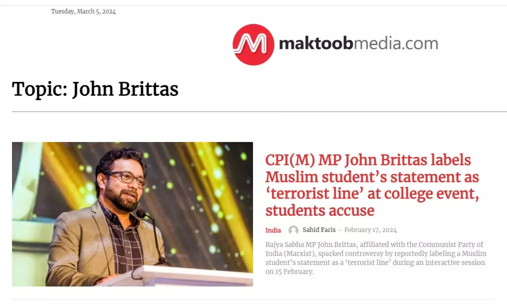 ജോണ് ബ്രിട്ടാസ് എം.പി നടത്തിയ 'തീവ്രവാദി' പരാമര്ശം സംബന്ധിച്ച് മക്ത്തൂബ് മീഡിയ നല്കിയ വാര്ത്ത