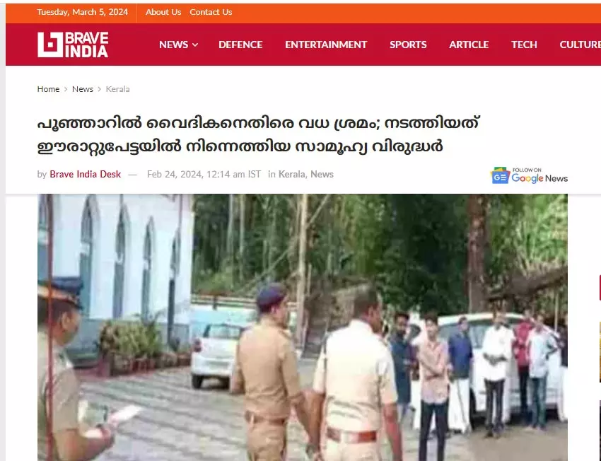 വാര്ത്തകളുടെ തുടക്കം മുതല്തന്നെ ഈരാറ്റുപേട്ടയിലെ മുസ്ലിം സമൂഹത്തെ നേരിട്ട് കുറ്റപ്പെടുത്തുന്ന രീതിയിലുള്ള വാര്ത്തകള് പുറത്തുവന്നിരുന്നു. 'ഈരാറ്റുപേട്ടയില് നിന്നെത്തിയ സാമൂഹ്യവിരുദ്ധരാണ് ആക്രമണത്തിന് പിന്നിലെ'ന്നാണ് ബ്രേവ് ഇന്ത്യ നല്കിയ വാര്ത്ത (പൂഞ്ഞാറില് വൈദികനെതിരേ വധശ്രമം; നടത്തിയത് ഈരാറ്റുപേട്ടയില് നിന്നെത്തിയ സാമൂഹ്യവിരുദ്ധര്, ബ്രേവ് ഇന്ത്യ, ഫെബ്രുവരി 24, 2024).