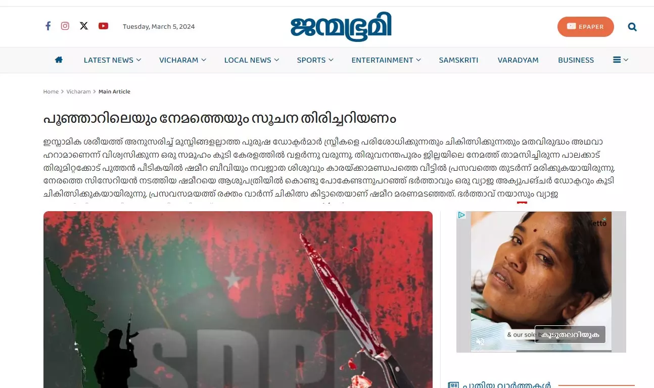 ഇസ്ലാമിക ശരിഅത്ത് അനുസരിച്ച് മുസ്ലിംകളല്ലാത്ത പുരുഷ ഡോക്ടര്മാര് സ്ത്രീകളെ പരിശോധിക്കുന്നത് 'ഹറാം' (ഇസ്ലാമിക നിയമ പ്രകാരം വിലക്കപ്പെട്ടത്) എന്നു വിശ്വസിക്കുന്നവര് കേരളത്തില് വര്ധിച്ചുവരുന്നുവെന്നാണ് നേമം നല്കുന്ന സൂചനയെന്ന് അമൃത ടി.വിയിലും ജനം ടി.വിയിലും മാധ്യമപ്രവര്ത്തകനായിരുന്ന ജി.കെ സുരേഷ് ബാബു ജന്മഭൂമിയില് ഫെബ്രുവരി 26ന് എഴുതിയ ലേഖനത്തില് അവകാശപ്പെടുന്നത്.