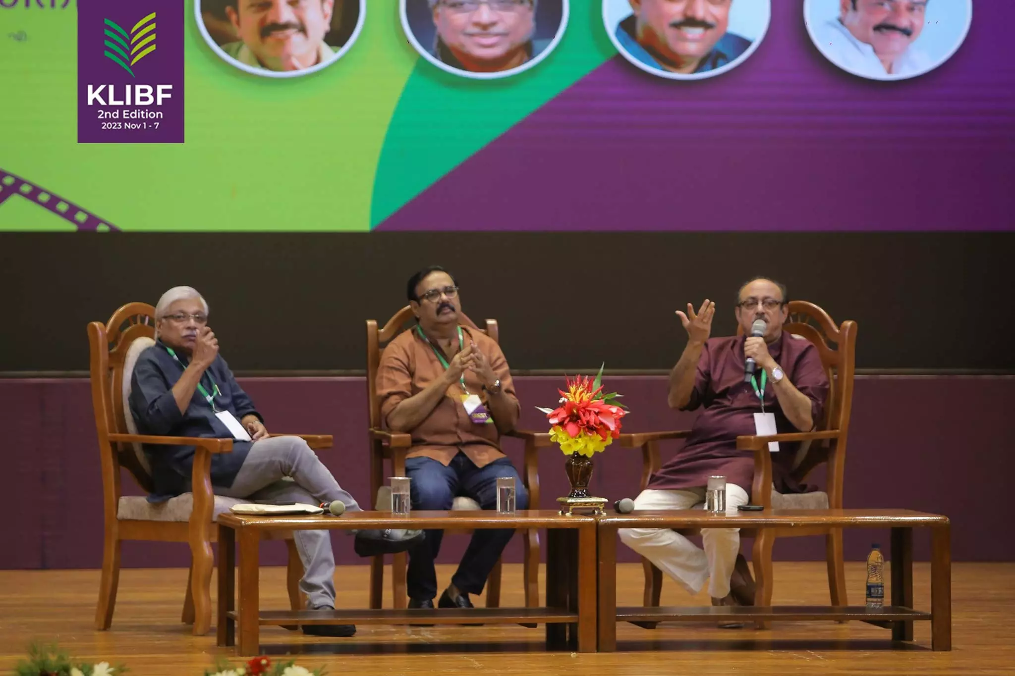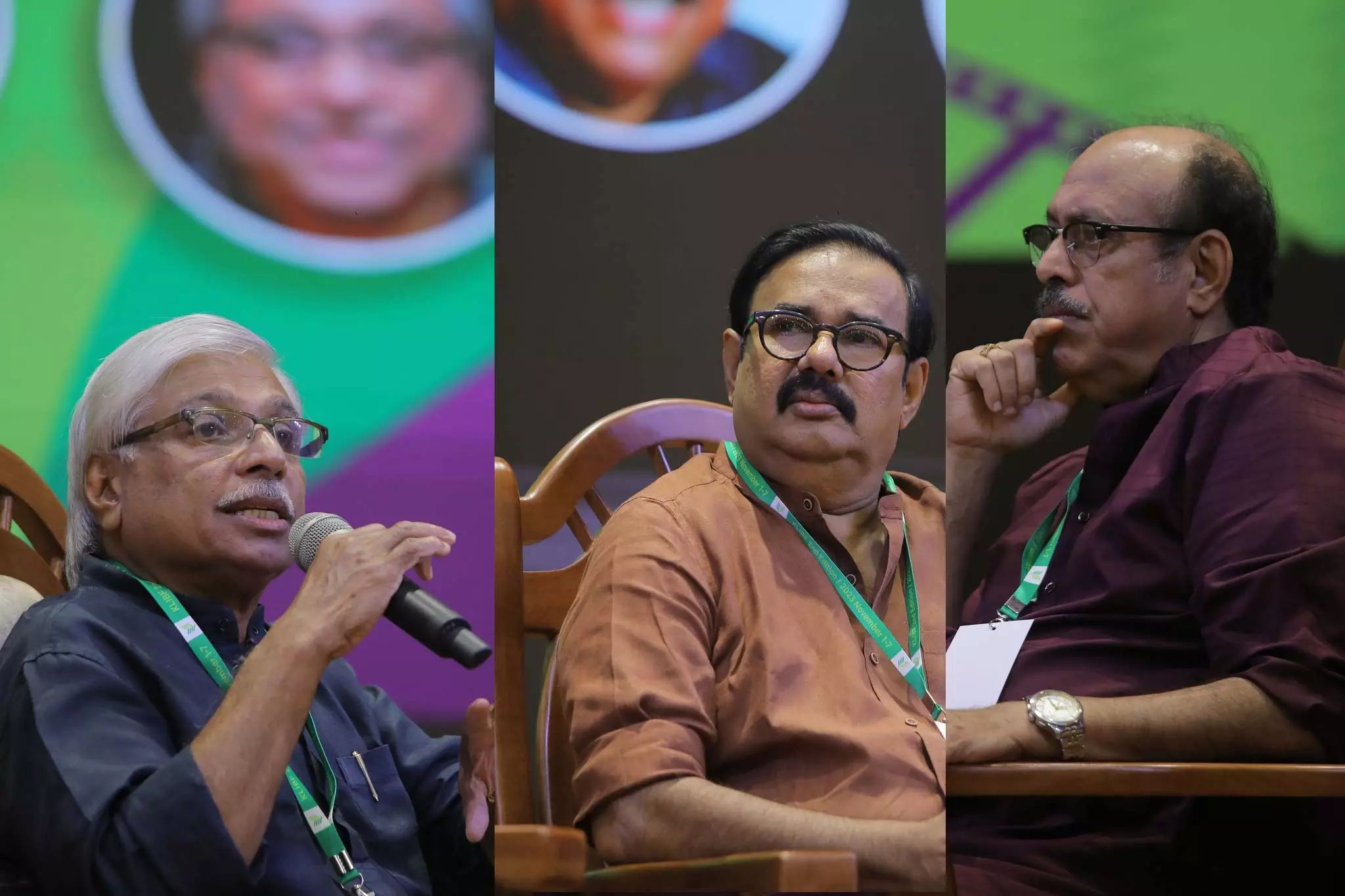 |കേരള നിയമസഭ അന്താരാഷ്ട്ര പുസ്തകോത്സവത്തിന്റെ ഭാഗമായി സംഘടിപ്പിച്ച സ്മൃതി സന്ധ്യയില് 'എണ്പതുകളിലെ മലയാള സിനിമ' എന്ന വിഷയത്തില് സംവിധായകന് കമല്, നിര്മാതാവ് ജി. സുരേഷ് കുമാര്, നടന് മണിയന്പിള്ള രാജു എന്നിവര് അനുഭവങ്ങള് പങ്കുവെക്കുന്നു.