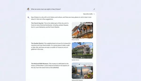 ന്യൂ ഓര്ലിയാന്സില് എവിടെയാണ് സന്ദര്ശിക്കേണ്ടത് എന്ന ചോദ്യത്തിന് മറുപടിയായി ഗൂഗിളിന്റെ ചാറ്റ്ബോട്ട് ബാര്ഡിന്റെ ദൃശ്യങ്ങള് കാണിക്കുന്ന ഒരു സ്ക്രീന്ഷോട്ട്.