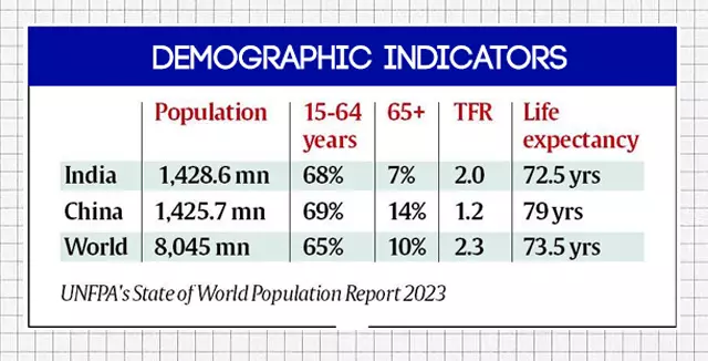 ചൈനയുടെ ജനസംഖ്യ 142.57 കോടി ജനസംഖ്യയും ഇന്ത്യയില് 142.86 കോടിയുമാണ് യു.എന് കണ്ടെത്തിയരിക്കുന്നത്. ലക്ഷങ്ങളുടെ വ്യത്യാസം മാത്രമാണ് ചൈനയുമായുള്ളത്. 29 ലക്ഷം ആളുകളാണ് ഇന്ത്യയില് കൂടുതലായുള്ളത്, അത് ഇനിയും വര്ധിക്കും. ചൈനയിലെ ജനസംഖ്യയും ജനന നിരക്കും കുറയുന്നു എന്നാണ് കണക്കുകള് പറയുന്നത്. അതിന് പല കാരണങ്ങള് ഉണ്ട്. 1986കളില് ചൈന ആവിഷ്കരിച്ച ഒരു കുട്ടി നയമാണ് അവര്ക്ക് തിരിച്ചടിയായത്. ഒരുപക്ഷേ, അവര് ബോധപൂര്വ്വം ജനസംഖ്യ കുറക്കാന് സ്വീകരിച്ച നടപടിയായിരിക്കാം ഇത്. അതുകൊണ്ടുതന്നെ ചൈനയുടെ ജനസംഖ്യ നിരക്ക് കുറഞ്ഞു വരികയാണ്. ഇപ്പോള് ചൈന പ്രായാധിക്യമുള്ളവരുടെ രാജ്യമായി മാറിയിരിക്കുകയാണ്. പ്രായാധിക്യമുള്ളവരുടെ ശതമാനം കൂടിവരുകയാണ്. ചൈനയിലെ 14 ശതമാനം ആളുകള് 64 വയസ്സ് പിന്നിട്ടവരാണ്. ഇന്ത്യയില് 15 വയസ്സിനും 64 വയസ്സിനുമിടയിലുള്ളവര് 66 ശതമാനമാണ്. ആരോഗ്യമുള്ള, യൗവനത്തിലുള്ളവരും വാര്ധക്യത്തിലേക്ക് പ്രവേശിക്കാത്തവരും ജോലിചെയ്യുന്നവരുമായ പ്രൊഡക്ടീവ് ജനസംഖ്യ വിഭാഗമാണ് ഈ 66 ശതമാനം. പത്തിനും 19 വയസ്സിനും ഇടയിലുള്ളവര് മൊത്തം ജനസംഖ്യയുടെ 18 ശതമാനമാണ്. 25 ശതമാനം ആളുകള് 14 വയസ്സിന് താഴെയുള്ള-കുട്ടികളാണ്. ഇന്ത്യയില് ശരാശരി ആയുസ്സ് പുരുഷന്മാരുടെത് 71 ഉം സ്ത്രീകളുടേത് 74 ഉം ആണെന്നുകൂടി റിപ്പോര്ട്ടില് പറയുന്നു.