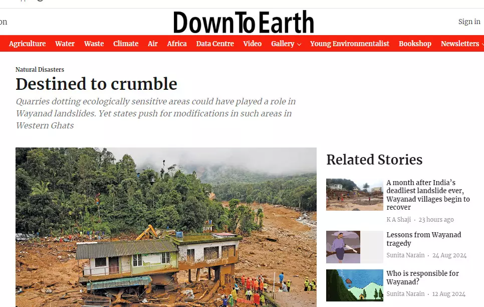 |വയനാട് ഉരുള്പൊട്ടലിന്റെ കാരണങ്ങളെ വിശകലനം ചെയ്തുകൊണ്ട് ശാസ്ത്ര ലേഖിക രോഹിണി കൃഷ്ണമൂര്ത്തിയും ഡാറ്റാ ജേര്ണലിസ്റ്റായ പുലാഹ റോയിയും ചേര്ന്ന് ഡൗണ് ടു എര്ത്തില് എഴുതിയ ലേഖനത്തിന്റെ സംക്ഷിപ്ത വിവര്ത്തനം.