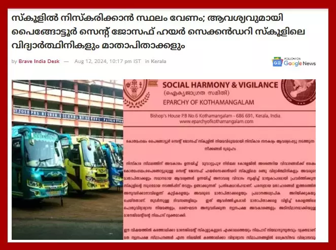 പൈങ്ങോട്ടൂരിലെ സംഭവം ദുരൂഹമാണെന്നാണ് കോതമംഗലം രൂപത ജാഗ്രതാ സമിതി ആരോപിക്കുന്നത്. ക്രൈസ്തവസഭകളടെ വിദ്യാഭ്യാസസ്ഥാപനങ്ങള്ക്കു മേല് നിരന്തരം ഉയരുന്ന ഇത്തരം ഭീഷണികള് മതേതര സമൂഹത്തിന് ചേര്ന്നതല്ല. സമൂഹത്തില് നിലനില്ക്കുന്ന മതസൗഹാര്ദ്ദവും സമാധാനാന്തരീക്ഷവും തകര്ക്കുന്ന നിലപാടുകളും അംഗീകരിക്കാനാവില്ല. ഈ വിഷയത്തില് കത്തോലിക്കാ മാനേജ്മെന്റ് സ്കൂളുകളുടെ എക്കാലത്തെയും നിലപാട് നിയമാനുസൃതവും വ്യക്തവുമാണ് (മറുനാടന് മലയാളി, ആഗസ്റ്റ് 12, 2024). സെക്കിന ടിവിയും ഇതേ വാര്ത്ത റിപ്പോര്ട്ട് ചെയ്തു.