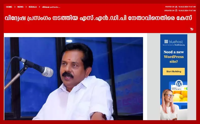 ഹിന്ദുത്വ നേതാവിന്റെ വിദ്വേഷപ്രസംഗം