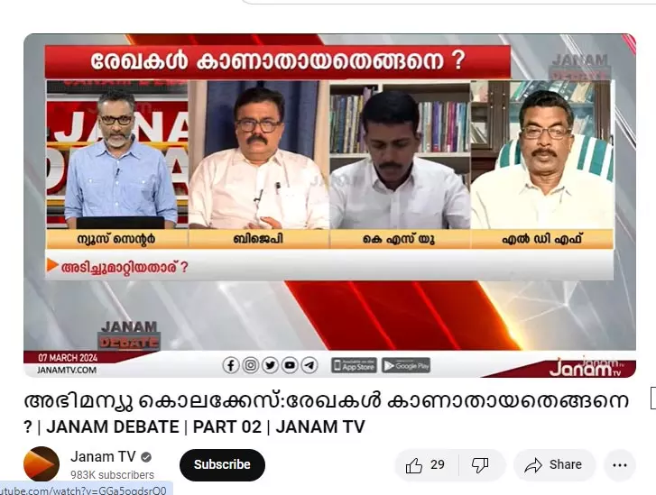 രേഖ നഷ്ടപ്പെട്ടതുമായി ബന്ധപ്പെട്ട് രണ്ട് വാദങ്ങളാണ് ഉയര്ന്നത്. കോടതി മതതീവ്രവാദികളുടെ പിടിയിലാണെന്നതായിരുന്നു ഒരു പക്ഷത്തിന്റെ വാദം. തെരഞ്ഞെടുപ്പിന്റെ ഭാഗമായുണ്ടായ രാഷ്ട്രീയ നീക്കുപോക്കാണെന്ന് മറ്റൊരു വിഭാഗവും വാദിച്ചു. ഹിന്ദുത്വരാണ് ആദ്യ വാദമുയര്ത്തിയതെങ്കില് മതേതരരുടെ മുന്കയ്യിലാണ് രണ്ടാമത്തെ വാദം പുറത്തുവന്നത്. അഭിമന്യു കൊലക്കേസ് രേഖകള് കാണാതായതെങ്ങനെ? എന്ന ശീര്ഷകത്തില് 2024 മാര്ച്ച് ഏഴിന് ജനം ടി.വിയില് നടന്ന ചര്ച്ച മുസ്ലിം വിരുദ്ധ വംശീയവത്കരണത്തിന്റെ ഒരു കേരളീയ മാതൃക തന്നെയായിരുന്നു.