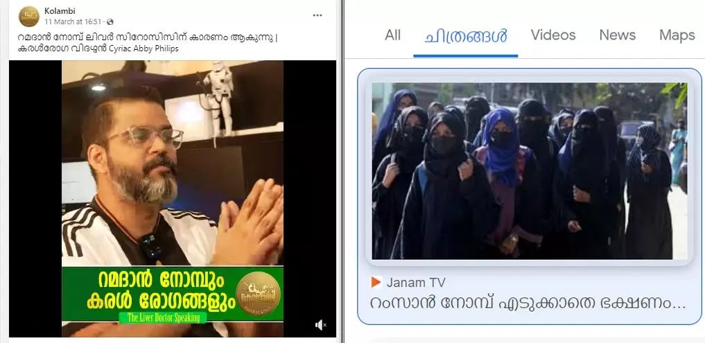റമദാന് നോമ്പ് ലിവര് സിറോസിസിന് കാരണമാകുന്നുവെന്നാണ് ഡോ. ആരിഫ് ഹുസൈനുമായുള്ള അഭിമുഖത്തില് കരള്രോഗ വിദഗ്ദന് ഡോ. സിറിയക്ക് അബി ഫിലിപ്സ് പറയുന്നത് ('റമദാന് നോമ്പ് ലിവര് സിറോസിസിന് കാരണമാകുന്നു', കോളാമ്പി, മാര്ച്ച് 11, 2024). റമദാന് മാസങ്ങളില് ലിവര് സിറോസിസ് രോഗികളുടെ എണ്ണം കൂടുന്നുവെന്ന് ഈജിപ്തില്നിന്ന് പഠനങ്ങളുണ്ടത്രെ. വെള്ളം കുടിക്കാതെയിരുന്നാല് അത് വര്ധിക്കും. പെട്ടെന്ന് ഫാസ്റ്റിങ് തുടങ്ങിയാല് ഡിഹൈഡ്രേഷന് ഉണ്ടാവും. വലിയ രോഗസാധ്യതയുണ്ട്. കിഡ്നി സ്റ്റോണ് മുതല് രോഗങ്ങള് ഉണ്ടാകും. ആരോഗ്യപരമായ വിശദീകരണങ്ങള്ക്കുശേഷം ആരിഫ് ഹുസൈന് മറ്റൊരു ആശങ്ക പങ്കുവയ്ക്കുന്നു - ഇത്തരം കാര്യങ്ങള് പറഞ്ഞാല് വിശ്വാസികള്ക്ക് മനസ്സിലാവില്ലെന്നാണ് അദ്ദേഹത്തിന്റെ പരാതി.