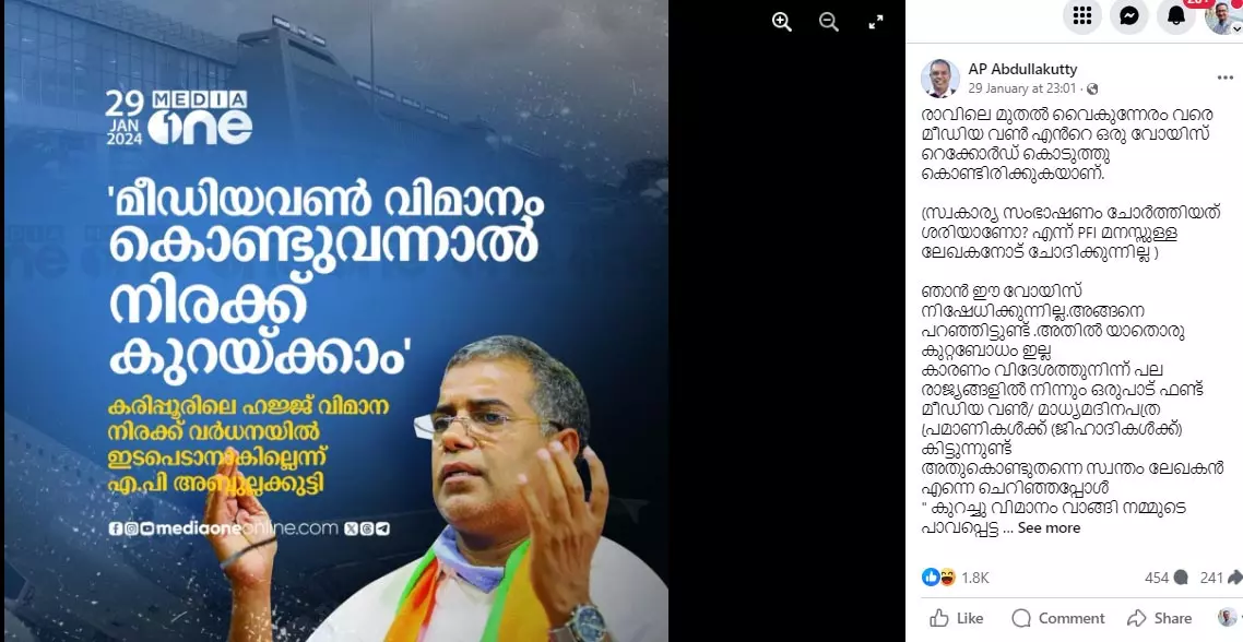 നിരക്ക് പ്രശ്നം ഗൗരവമായി ചര്ച്ച ചെയ്യുന്നതിനിടയിലാണ് കേന്ദ്ര ഹജ്ജ് കമ്മിറ്റി ചെയര്മാനും ബി.ജെ.പി ദേശീയ വൈസ് പ്രസിഡന്റുമായ എ.പി അബ്ദുല്ലക്കുട്ടിയുടെ നിരക്ക് സംബന്ധിച്ച ഒരു പ്രതികരണം പുറത്തുവന്നത്. (ഈ പ്രതികരണം നിരുത്തരവാദപരമായാണ് എടുത്തതെന്ന ആരോപണം അബ്ദുല്ലക്കുട്ടി ഉന്നയിച്ചിരുന്നു). ഈ വാര്ത്തക്കെതിരേ അബ്ദുല്ലക്കുട്ടി ഫേസ്ബുക്കില് ഒരു കുറിപ്പെഴുതി. കണ്ണൂരിലെയും കോഴിക്കോട്ടെയും ജമാഅത്തെ ഇസ്ലാമിയുടെ രണ്ടു നേതാക്കളില് ഒരാള് മകളെ പോര്ച്ചുഗീസ് ഭാഷയും മറ്റൊരാള് മകനെ ഫ്രഞ്ച് ഭാഷയും പഠിപ്പിച്ചുവെന്നും അത് ജിഹാദിലൂടെ യൂറോപ്പിനെ ഇസ്ലാമിക രാജ്യമാക്കാനാണെന്നുമായിരുന്നു അദ്ദേഹം എഴുതിയത് (ജനുവരി 31).