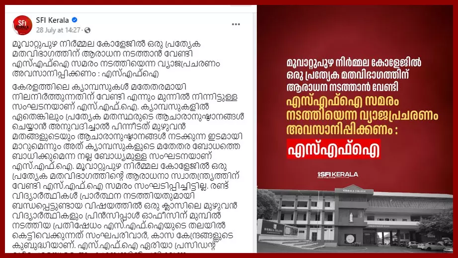 മൂവാറ്റുപുഴ നിര്മല കോളജില് ഒരു പ്രത്യേക മതവിഭാഗത്തിന് ആരാധന നടത്താന്വേണ്ടി എസ്.എഫ്.ഐ സമരം നടത്തിയെന്നത് വ്യാജപ്രചാരണമാണ്. കേരളത്തിലെ കാമ്പസുകള് മതേതരമായി നിലനിര്ത്തുന്നതിനുവേണ്ടി എന്നും മുന്നില്നിന്നിട്ടുള്ള സംഘടനയാണ് എസ്.എഫ്.ഐ. കാമ്പസുകളില് ഏതെങ്കിലും പ്രത്യേക മതസ്ഥരുടെ ആചാരാനുഷ്ഠാനങ്ങള് ചെയ്യാന് അനുവദിച്ചാല് പിന്നീടത് മുഴുവന് മതങ്ങളുടെയും ആചാരാനുഷ്ഠാനങ്ങള് നടക്കുന്ന ഇടമായി മാറും. അത് കാമ്പസുകളുടെ മതേതര ബോധത്തെ ബാധിക്കും. മൂവാറ്റുപുഴ നിര്മല കോളജില് ഒരു പ്രത്യേക മതവിഭാഗത്തിന്റെ ആരാധനാ സ്വാതന്ത്ര്യത്തിനുവേണ്ടി എസ്.എഫ്.ഐ സമരം സംഘടിപ്പിച്ചിട്ടില്ല. രണ്ട് വിദ്യാര്ഥികള് പ്രാര്ഥന നടത്തിയതുമായി ബന്ധപ്പെട്ടുണ്ടായ വിഷയത്തില് ഒരു ക്ലാസിലെ മുഴുവന് വിദ്യാര്ഥധികളും പ്രിന്സിപ്പള് ഓഫീസിന് മുമ്പില് നടത്തിയ പ്രതിഷേധം എസ്.എഫ്.ഐയുടെ തലയില് കെട്ടിവെക്കുന്നത് സംഘ്പരിവാര്, കാസ കേന്ദ്രങ്ങളുടെ കുബുദ്ധിയാണ്. സംഘപരിവാര് - കാസ നുണ ഫാക്ടറികളില്നിന്ന് പടച്ചുവിടുന്ന നുണ സോഷ്യല് മീഡിയയിലെ ഇടത് പ്രൊഫൈലുകള് ഉള്പ്പെടെ ഏറ്റെടുക്കുന്നത് ഖേദകരമാണ് (എസ്.എഫ്.ഐ എഫ്.ബി ഒഫീഷ്യല് പേജ്, ജൂലൈ 28, 2024).