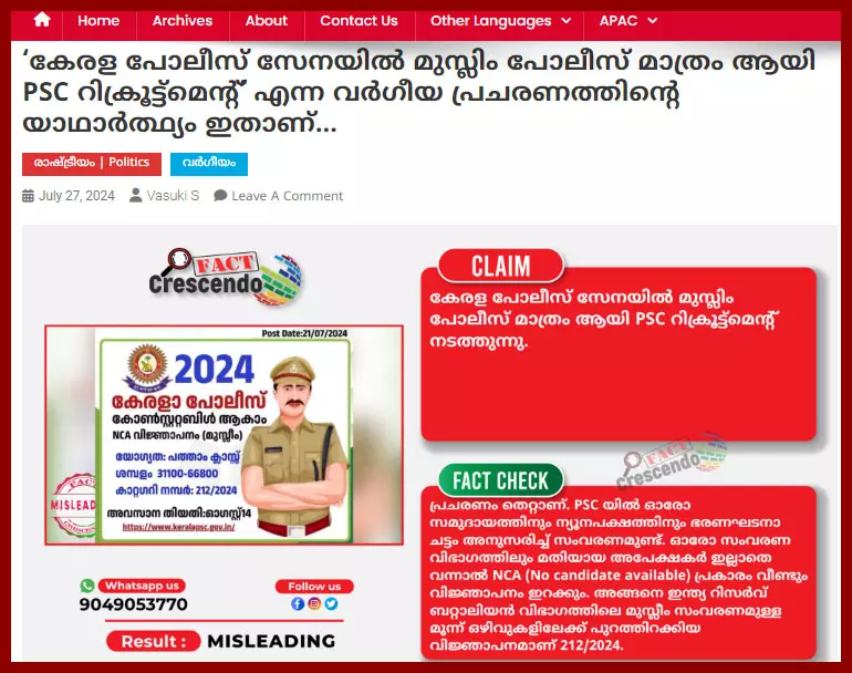 മുസ്ലിംസമുദായത്തില് നിന്നുള്ളവര്ക്ക് മാത്രമായി പൊലീസില് നിയമനമുണ്ട് എന്നു സൂചിപ്പിച്ച് ഒപ്പമുള്ള അടിക്കുറിപ്പ് ഇങ്ങനെ: '' കേരള പൊലീസ് സേനയില് മുസ്ലിം പൊലീസ് മാത്രം ആയി PSC റിക്രൂട്ട്മെന്റ്.... ആരെങ്കിലും അറിഞ്ഞോ. ഇത് സത്യമോ?'' ഫാക്റ്റ് ചെക്കിംഗ് വെബ്സൈറ്റ് ഫാക്റ്റ് ക്രസന്ഡോ മലയാളം (27 ജൂലൈ 2024) നടത്തിയ പരിശോധനയില് വസ്തുതകള് പുറത്തുകൊണ്ടുവന്നു.