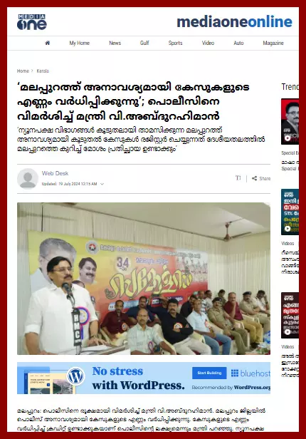 'മലപ്പുറത്ത് അനാവശ്യമായി കേസുകളുടെ എണ്ണം വര്ധിപ്പിക്കുന്നു'; പൊലീസിനെ വിമര്ശിച്ച് മന്ത്രി വി.അബ്ദുറഹിമാന് എന്ന വാര്ത്ത പുറത്തുവന്നു. 'ന്യൂനപക്ഷ വിഭാഗങ്ങള് കൂടുതലായി താമസിക്കുന്ന മലപ്പുറത്ത് അനാവശ്യമായി കൂടുതല് കേസുകള് രജിസ്റ്റര് ചെയ്യുന്നത് ദേശീയതലത്തില് മലപ്പുറത്തെക്കുറിച്ച് മോശം പ്രതിച്ഛായ ഉണ്ടാക്കും' (18 ജൂലൈ 2024 മീഡിയവണ്). മലപ്പുറം ജില്ലയില് പൊലീസ് അനാവശ്യമായി കേസുകളുടെ എണ്ണം വര്ധിപ്പിക്കുന്നു. കേസുകളുടെ എണ്ണം വര്ധിപ്പിച്ച് ക്രഡിറ്റ് ഉണ്ടാക്കുകയാണ് പൊലീസിന്റെ ലക്ഷ്യമെന്നും മന്ത്രി പറഞ്ഞു. ന്യൂനപക്ഷ വിഭാഗങ്ങള് കൂടുതലായി താമസിക്കുന്ന മലപ്പുറത്ത് അനാവശ്യമായി കൂടുതല് കേസുകള് രജിസ്റ്റര് ചെയ്യുന്നത് ദേശീയതലത്തില് മലപ്പുറത്തെ കുറിച്ച് മോശം പ്രതിച്ഛായ ഉണ്ടാക്കും. കേസുകള് എടുക്കാനായി സാധരണ പൊലീസ് ഉദ്യോഗസ്ഥരെ സീനിയര് ഉദ്യോഗസ്ഥര് ഭീഷണിപ്പെടുത്തുന്നുവെന്നും മന്ത്രി കൂട്ടിച്ചേര്ത്തു. പൊലീസ് ഓഫിസേഴ്സ് അസോസിയേഷന് മലപ്പുറം ജില്ലാ സമ്മേളനത്തിലാണ് മന്ത്രി പൊലീസിനെ വിമര്ശിച്ചത്. മലപ്പുറത്ത് സര്ക്കാര് നയത്തിന് വിപരീതമായാണ് പൊലീസ് പ്രവര്ത്തിക്കുന്നതെന്ന ആക്ഷേപമുണ്ട്. പൊലീസ് ജനങ്ങളോട് സൗമ്യമായും മാന്യമായും പെരുമാറണമെന്നും അദ്ദേഹം പറഞ്ഞു.