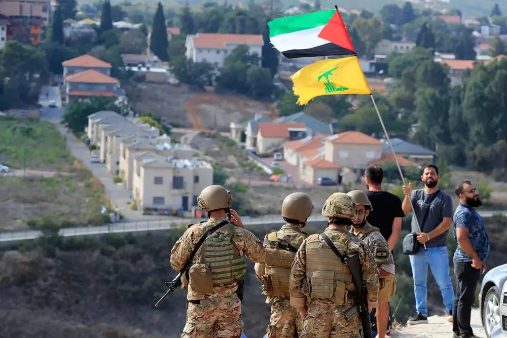 | ലെബനാന്-ഇസ്രായേല് അതിര്ത്തിയില് ഇസ്രായേല് സേനക്കുനേരെ ഫലസ്തീന്, ഹിസ്ബുല്ല പതാകകള് വീശുന്ന ഹിസ്ബുല്ല പ്രവര്ത്തകര്.