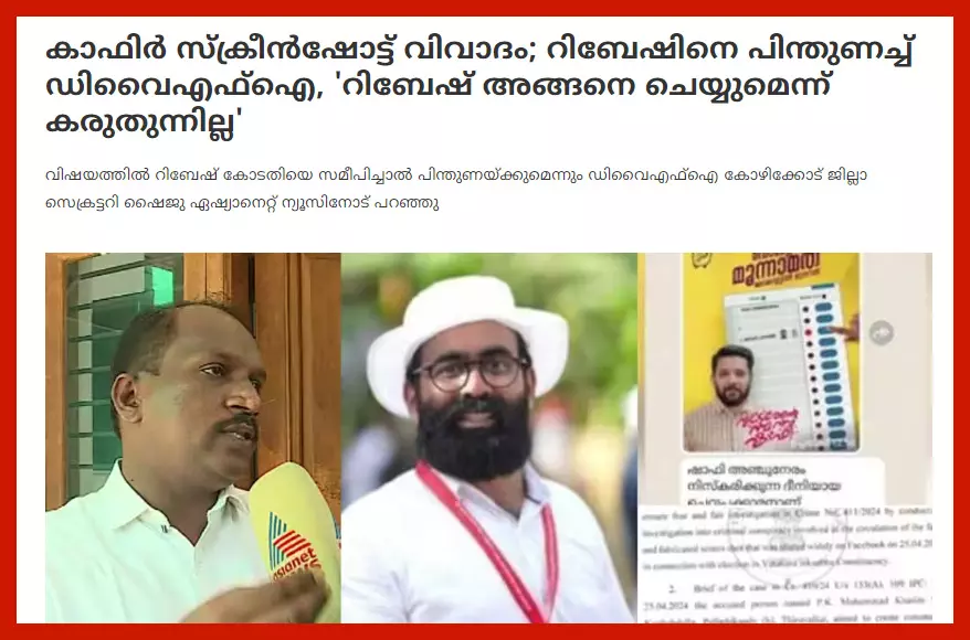 വിവാദ കാഫിര് സ്ക്രീന് ഷോട്ട് നിര്മിക്കപ്പെട്ടത് യുഡിഎഫ് കേന്ദ്രങ്ങളില് തന്നെയെന്നും ഫോര്വേഡ് ചെയ്തത് അബദ്ധത്തിലെന്നും ഡിവൈഎഫ്ഐ സംസ്ഥാന അധ്യക്ഷന് വി. വസീഫ് പറഞ്ഞു: അന്വേഷണം പൂര്ണതയില് എത്തുമ്പോള് കാര്യങ്ങള് വ്യക്തമാകും. അന്വേഷണത്തിന് വിധേയനായ ഡിവൈഎഫ്ഐ നേതാവ് മൊബൈല് ഹാജരാക്കിയിട്ടുണ്ട്. അബദ്ധത്തില് ചില ഗ്രൂപ്പുകള് പ്രചരിപ്പിച്ചിട്ടുണ്ടാകാം. പക്ഷേ, ഇത് നിര്മിച്ചവരെയാണ് പിടിക്കേണ്ടത്. ആരാണോ നിര്മിച്ചത് അവരെ പിടിക്കണം. സമഗ്രമായി അന്വേഷിക്കണം. പിന്നില് യുഡിഎഫിലെ ചിലരുടെ അജണ്ടയുണ്ട്. മറ്റു മണ്ഡലങ്ങളില് ഇല്ലാത്ത തരത്തിലുള്ള പ്രചാരണ കോലാഹലം വടകരയിലുണ്ടായിരുന്നു. സോഷ്യല്മീഡിയയില് അഭിരമിക്കുന്ന ഒരു ഗ്രൂപ്പ് വടകരയിലെ തെരഞ്ഞെടുപ്പിനെ ഹൈജാക്ക് ചെയ്തു. അത് സത്യമാണ്. അതിന്റെ പിന്നില് യുഡിഎഫിലെയും യൂത്ത് ലീഗിലെയും യൂത്ത് കോണ്ഗ്രസിലെയും ചിലരാണ് (റിപ്പോര്ട്ടര് ടിവി, ആഗസ്റ്റ് 15, 2024).
